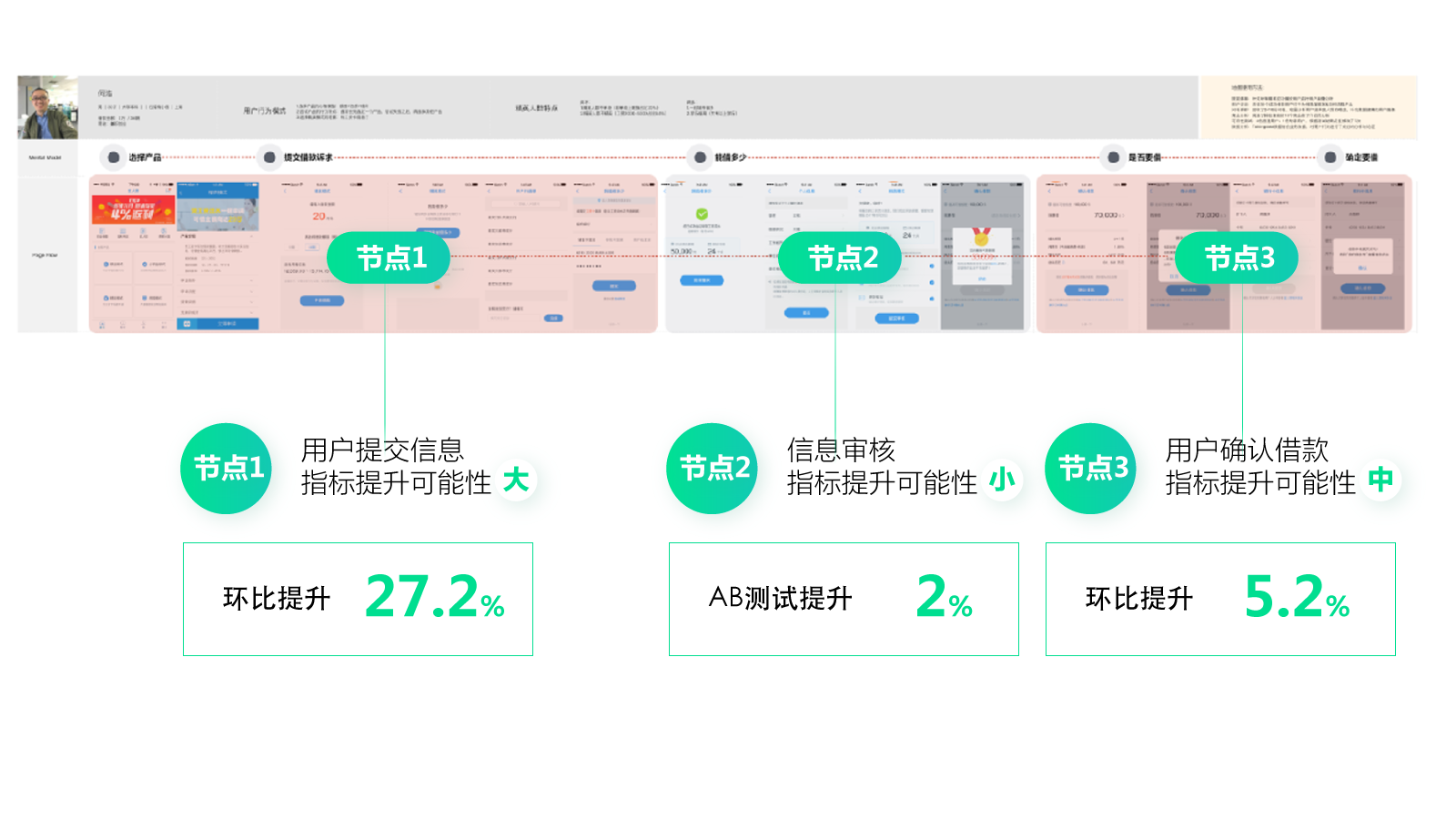 所以,我们可以把重心放在节点一,重点看流程优化后,这一节点的转化情况。结果果然不出所料:节点一的转化率环比提升了27%;节点二无法验证,因为数据波动明显,通过AB测试也只提升了2%;节点三的转化率环比提升了5%。