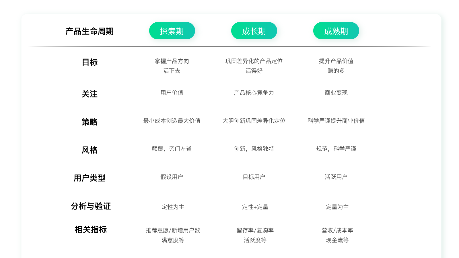 既然产品的发展阶段可以统合起来,那这里我们就统一用探索期、成长期、成熟期、二次探索期来解释吧。