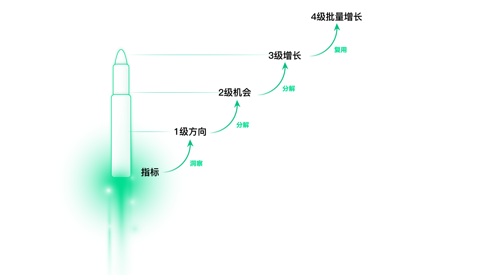 最开始是指标,然后围绕指标、通过洞察得到一级假设(一级方向);再用同样的指标、洞察、假设的思路分解一级假设得到二级假设(二级机会);然后再用指标、洞察、假设、分解、实验的思路,分解二级假设落地三级增长;接下来沉淀实验的成果,不断复用、延展,带来四级批量增长。