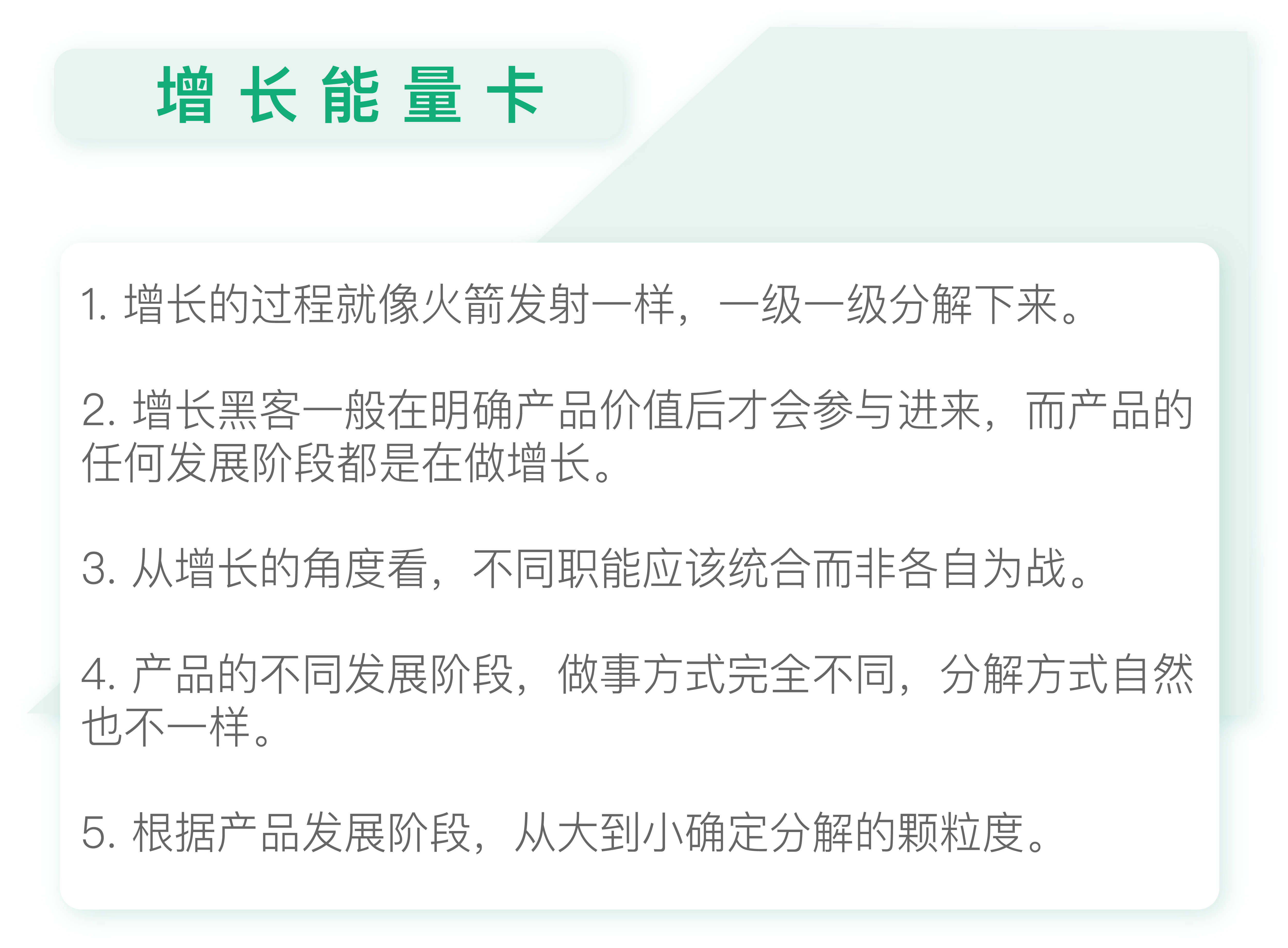 如果你不能确定当前的阶段以及应该如何分解,那就“从大到小”去探索,这样是效率最高的。也就是先用锯子,效果不好换成斧子,效果还不好就换成小锉刀。这样就能让我们快速找到合适的分解颗粒度,从而落地增长。