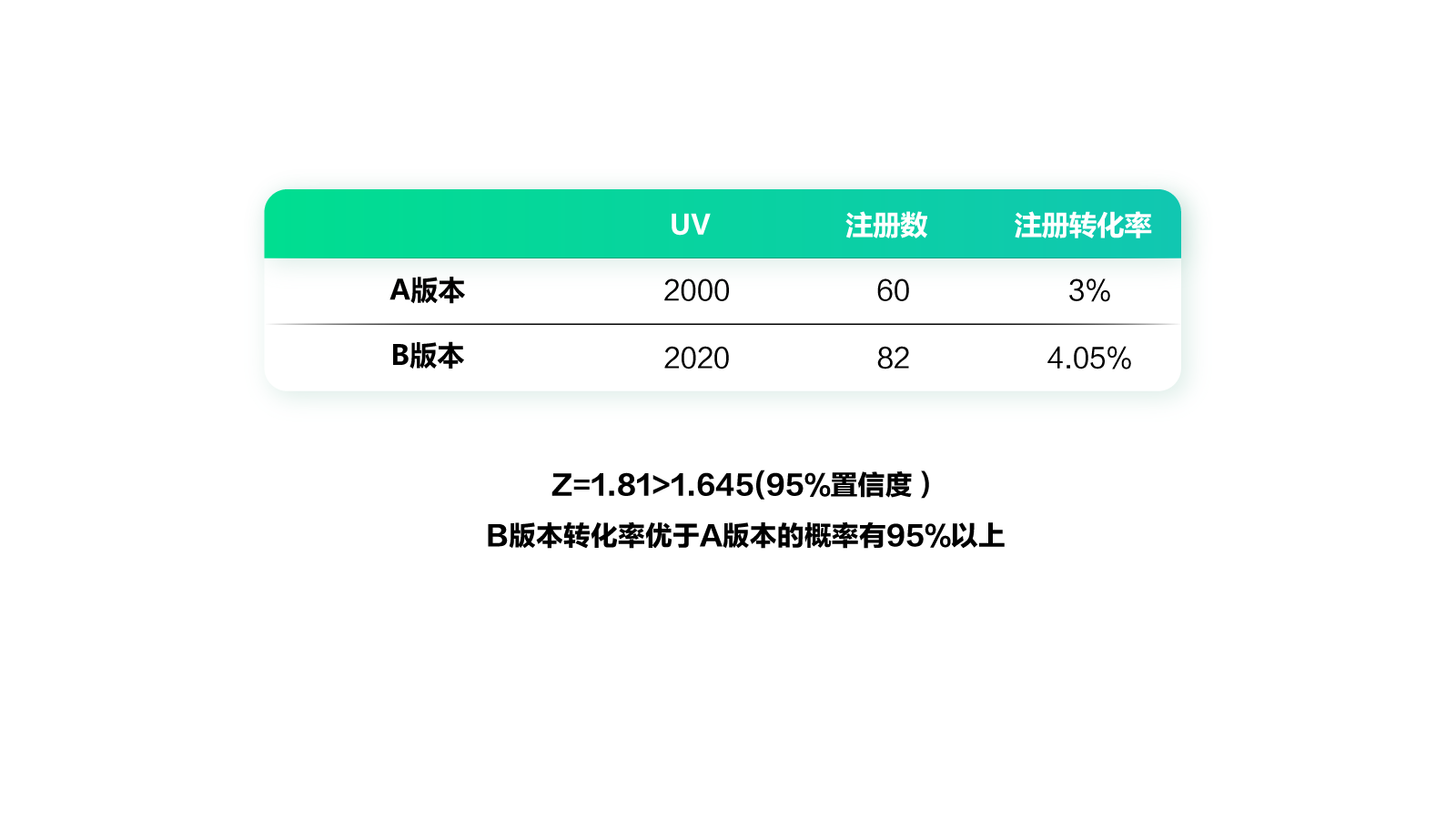 我们再来看另一个例子:A版本UV2000,注册数60,注册转化率3%;B版本UV2020,注册数82,注册转化率4.05%。