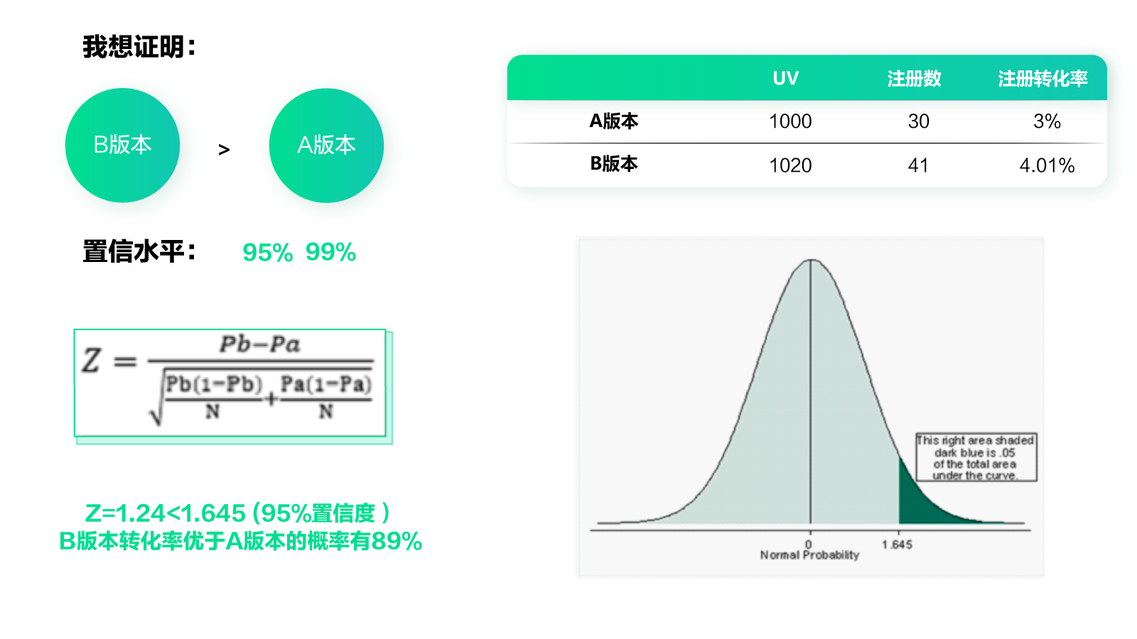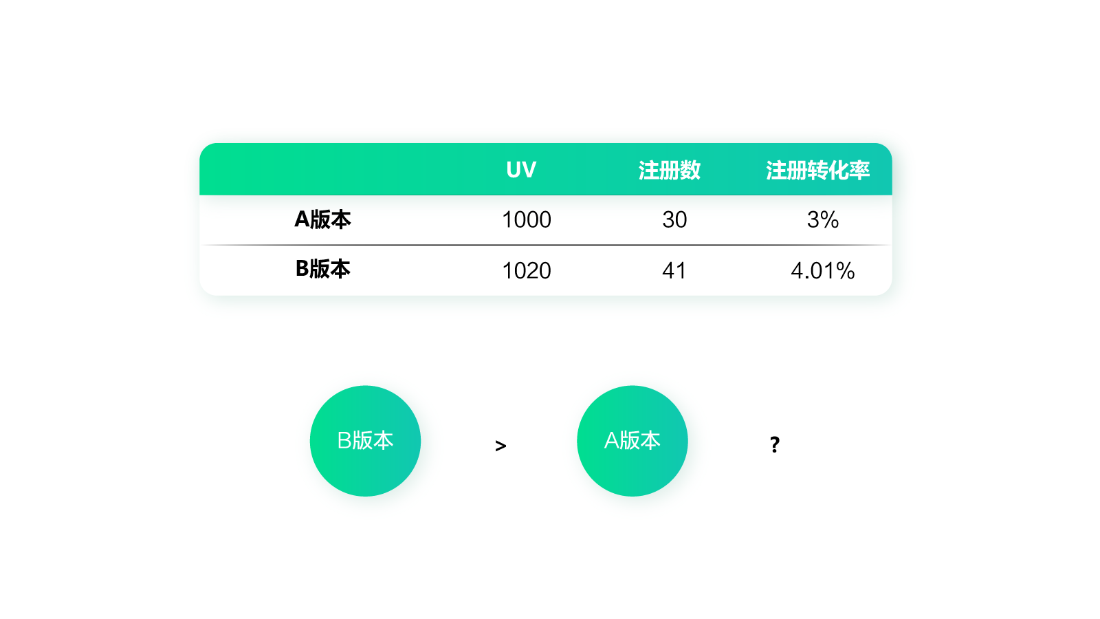 我们再来看下面这样一个测试数据:A版本UV1000,注册数30,注册转化率3%;B版本UV1020,注册数41,注册转化率4.01%。先不考虑时间的问题,你能判断B版本比A版本效果更好吗?