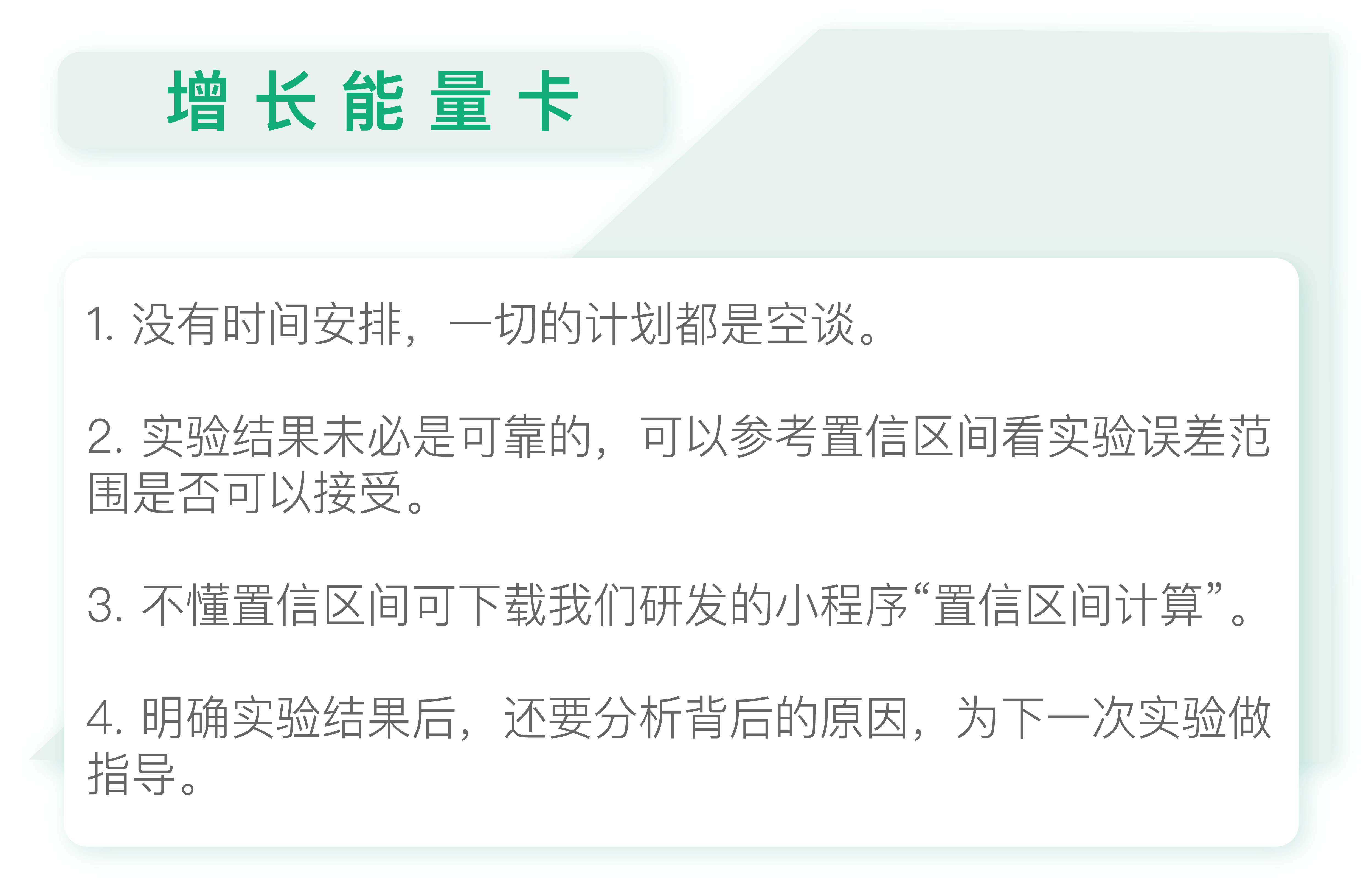 当然了,希望大家在实验中不要过于依赖置信区间的概念,毕竟增长是一件灵活、四两拨千斤的事情,而且我们也一直在强调“去专业化”。专业虽然是必要的,但是太执着于“专业”就没必要了。更重要的是洞察和判断,你千万不要被“专业”绑架。