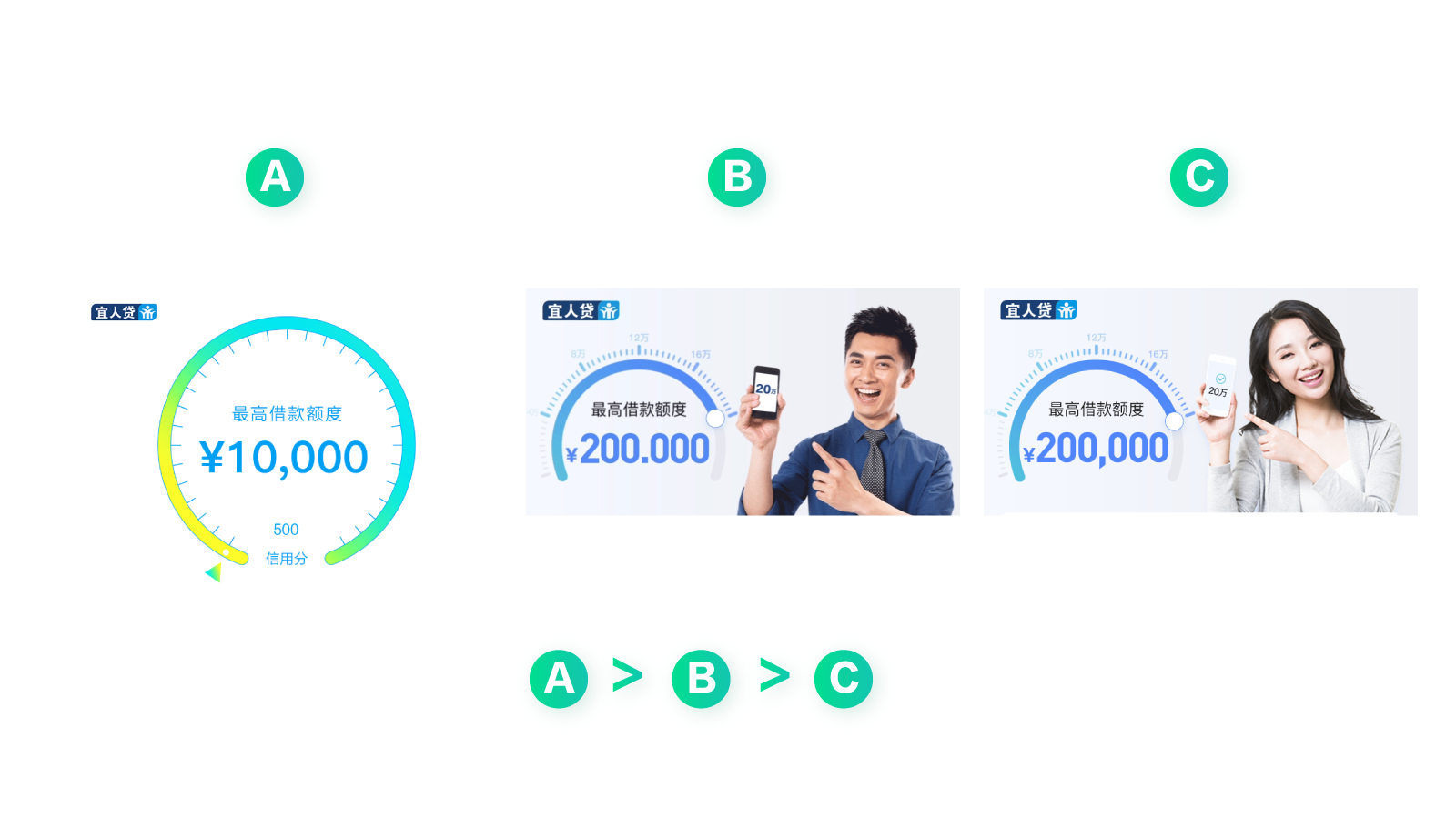 用户更喜欢看到和自己类似的,或者自己想成为的人。比如B版本,会让人感觉到,自己也能像那个男性一样成功借到钱,非常开心的样子。但是他看到C版本,就不会有这种感觉,会觉得这和自己没有关系。
