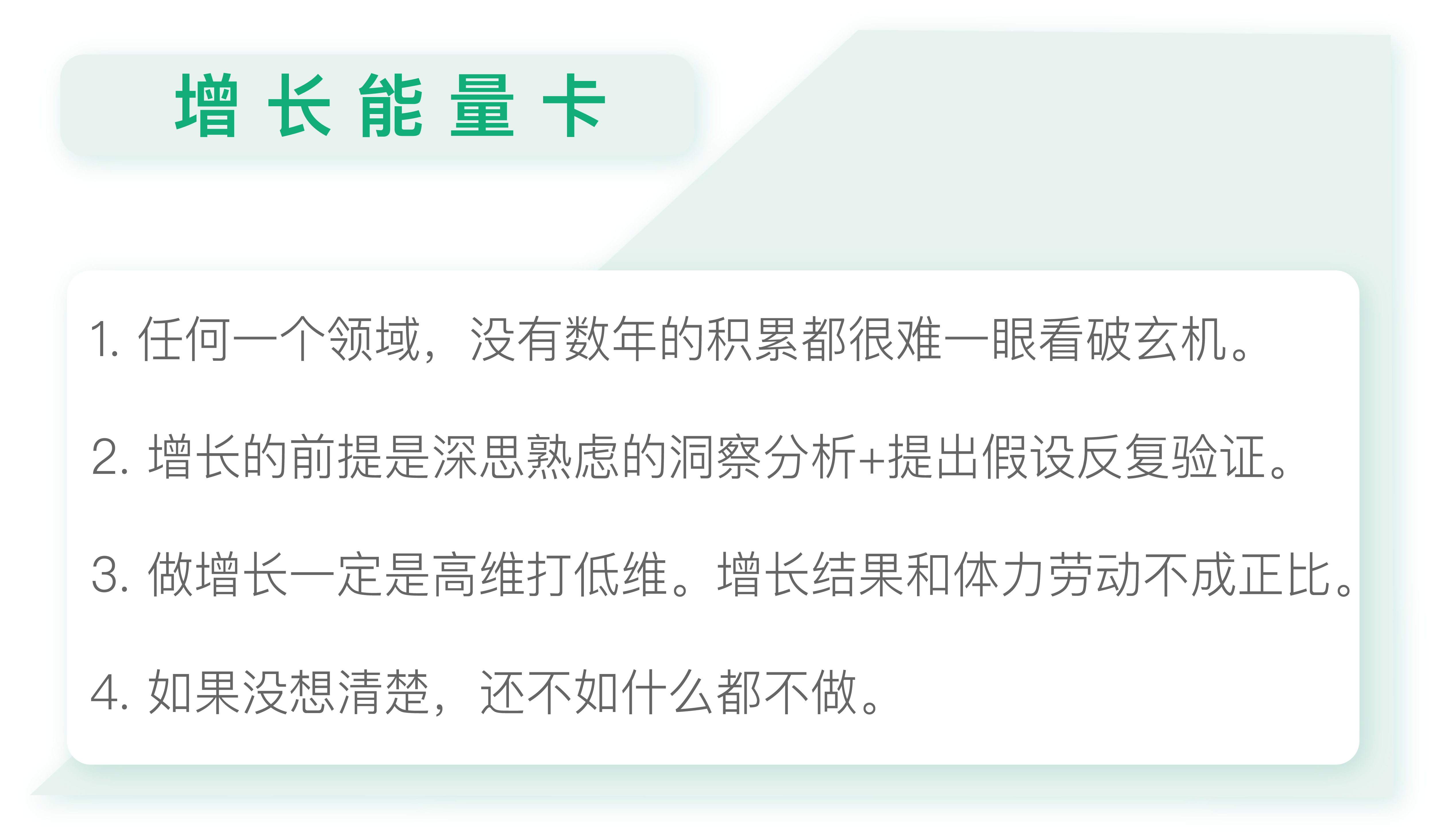 所以,增长真的不是常规思维可以理解的。不是说你在那天天加班,表现的自己很专业、很忙碌,就是有价值有产出。这段时间我做增长的经验就是,如果没有想清楚,还不如什么都不做呢。做的事情越多,可能越是南辕北辙。