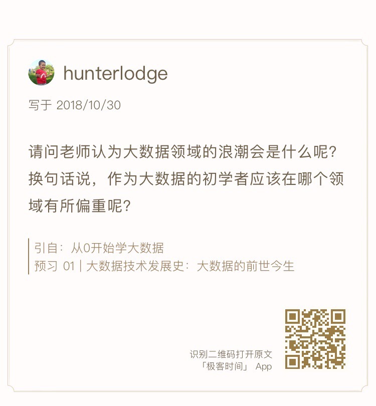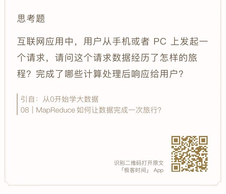 关于思考题,你会发现,我留的思考题很多都是和当期内容没有直接关联的,甚至和大数据无关的。它们或是相似的问题场景,或是有类似的解决思路,或是引申的一些场景。