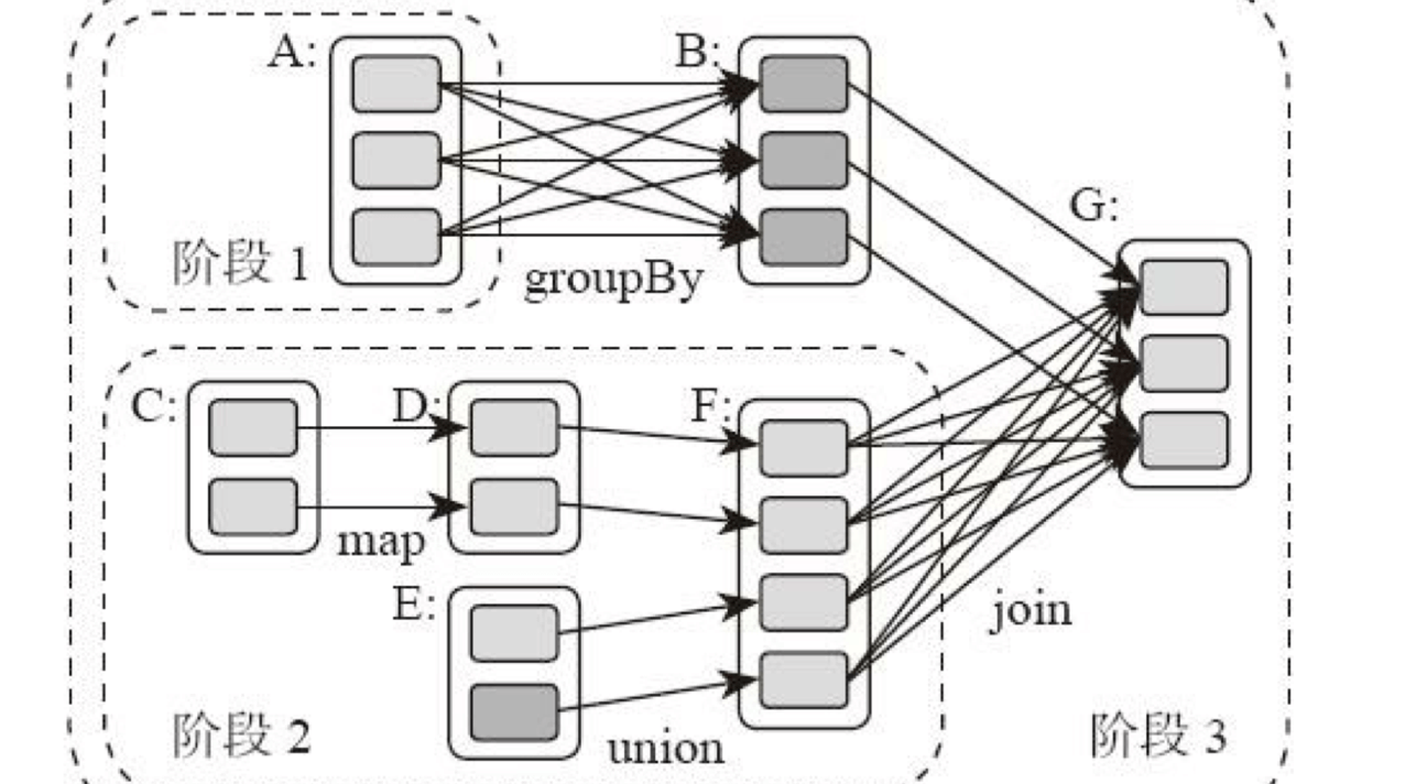所谓DAG也就是有向无环图,就是说不同阶段的依赖关系是有向的,计算过程只能沿着依赖关系方向执行,被依赖的阶段执行完成之前,依赖的阶段不能开始执行,同时,这个依赖关系不能有环形依赖,否则就成为死循环了。下面这张图描述了一个典型的Spark运行DAG的不同阶段。