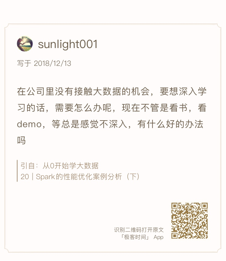 第一个层次是练习实践,我的专栏剖析架构原理居多,这是专栏定位决定的,而且学习大数据真正的难度,或者说决定你技术高度的依然是你是否理解了大数据技术的核心原理。但是大数据的学习一定要配合练习实践,不管是Hadoop、Spark、Hive的部署,还是编程练习实践,网上的教程都有很多,step by step入门学习的资料也很多。通过这些练习实践,结合专栏的原理分析,可以由表及里,从如何上手操作,到理解背后的原理机制,最后能够做到融会贯通。我看到专栏评论里很多同学贴了代码上来,一边学习一边实践,我们向这些同学学习。
