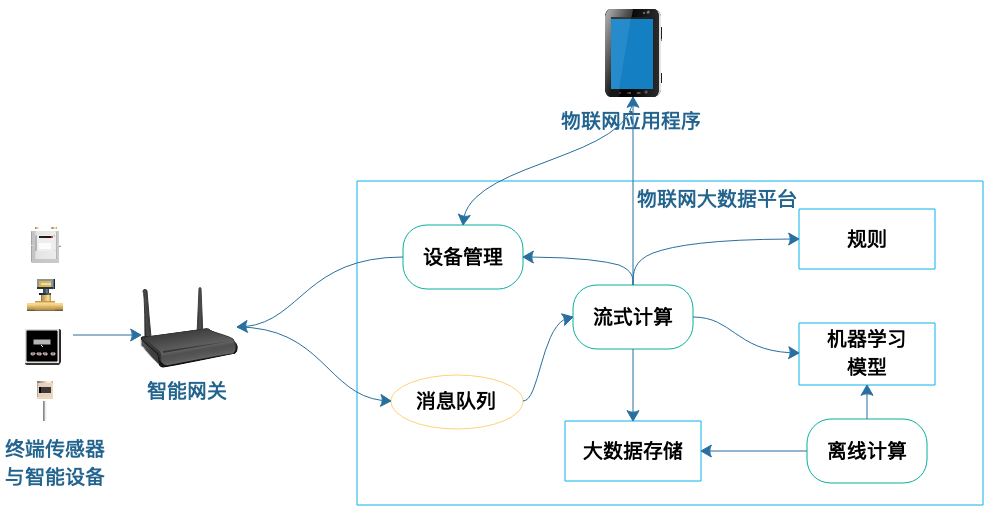 这样就构成一个典型的物联网“端-云-端”架构,其中两个端分别是传感器与智能设备端,以及应用程序设备端,而云则是大数据云计算平台。