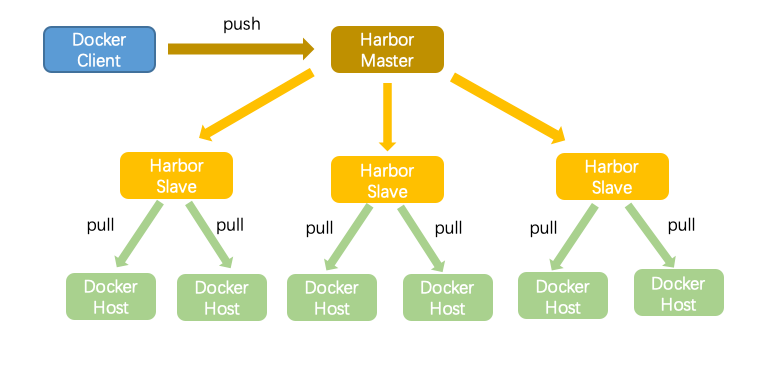 Harbor所采取的主从复制的方案是,把镜像传到一个主镜像仓库实例上去,然后其他从镜像仓库实例都从主镜像仓库实例同步,它的实现就像下图所描述的一样。