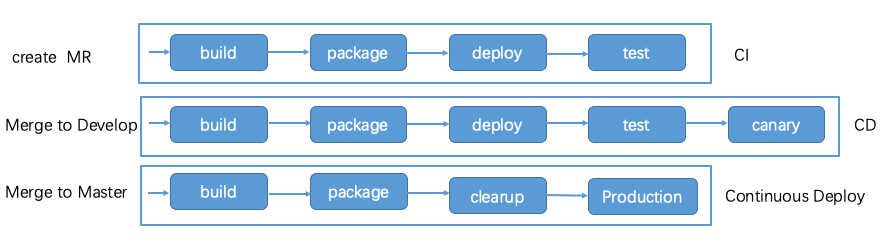 2.持续交付,这个步骤的主要作用是确保所有代码合并Merge Request到Develop分支后,Develop分支的代码能够在生产环境中测试通过,并进行小流量灰度验证,可随时交付到线上。主要包括五个阶段:build阶段(Develop分支的代码编译与单元测试)、package阶段(Develop分支的代码打包成Docker镜像)、deploy阶段(Develop分支的代码部署到测试环境)、test阶段(Develop分支的代码集成测试)、canary阶段(Develop分支的代码的小流量灰度验证)。