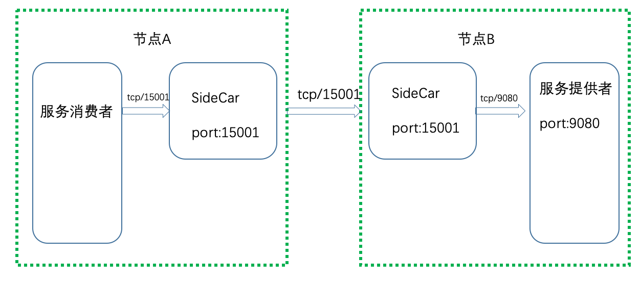 我们可以把服务消费者节点上的SideCar叫作正向代理,服务提供者节点上的SideCar叫作反向代理,那么Service Mesh架构的关键点就在于服务消费者发出的请求如何通过正向代理转发以及服务提供者收到的请求如何通过反向代理转发。从我的经验来看,主要有两种实现方案。