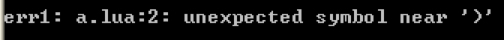 我们故意少写一个括号,然后将源代码命名为 a.lua,我们来运行看看。会出现一个这样的错误信息:-