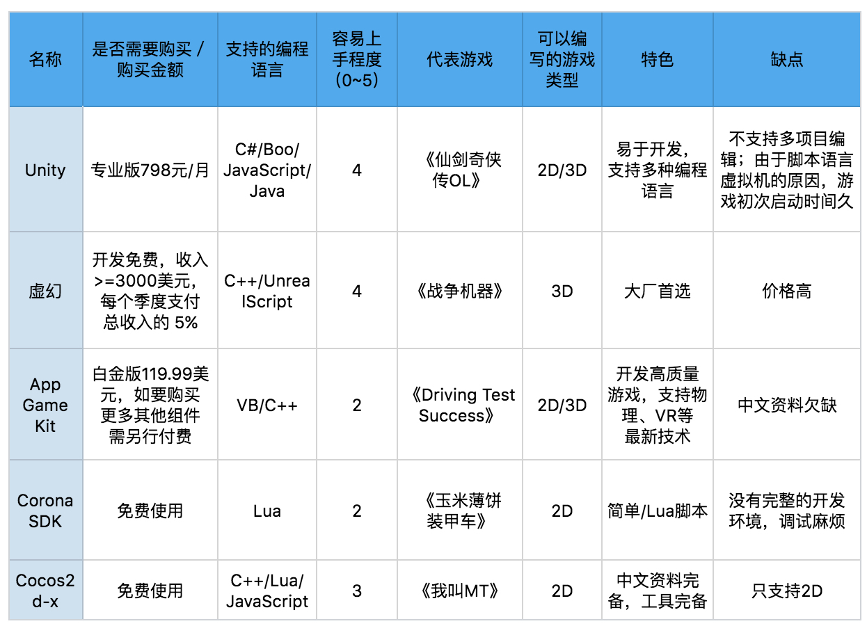 今天我介绍了这五款引擎,在开发的过程中,究竟该如何选择呢?如果接触游戏开发不久的话,你肯定还是会有点懵。 其实只要有选择,就有取舍,你只要明确自己的需求,然后结合自己的需求和引擎自身的特性,来对比选择就可以了。 这里我把这五种引擎的一些特点,总结了一下,列了一个表格。你在选择的时候,可以作为参考。