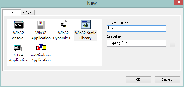 我们将下载到的Lua5.x.x.tar.gz解压缩到某个目录。在我写文章的时候,Lua的最新版本是5.3.4。在这个目录下,并没有我们所需要的MinGW Studio的项目文件,所以我们需要手工建立一个。我们在File->New->Projects选项下,建立一个Win32 Static Library,也就是Windows静态库,将名字设为lua。