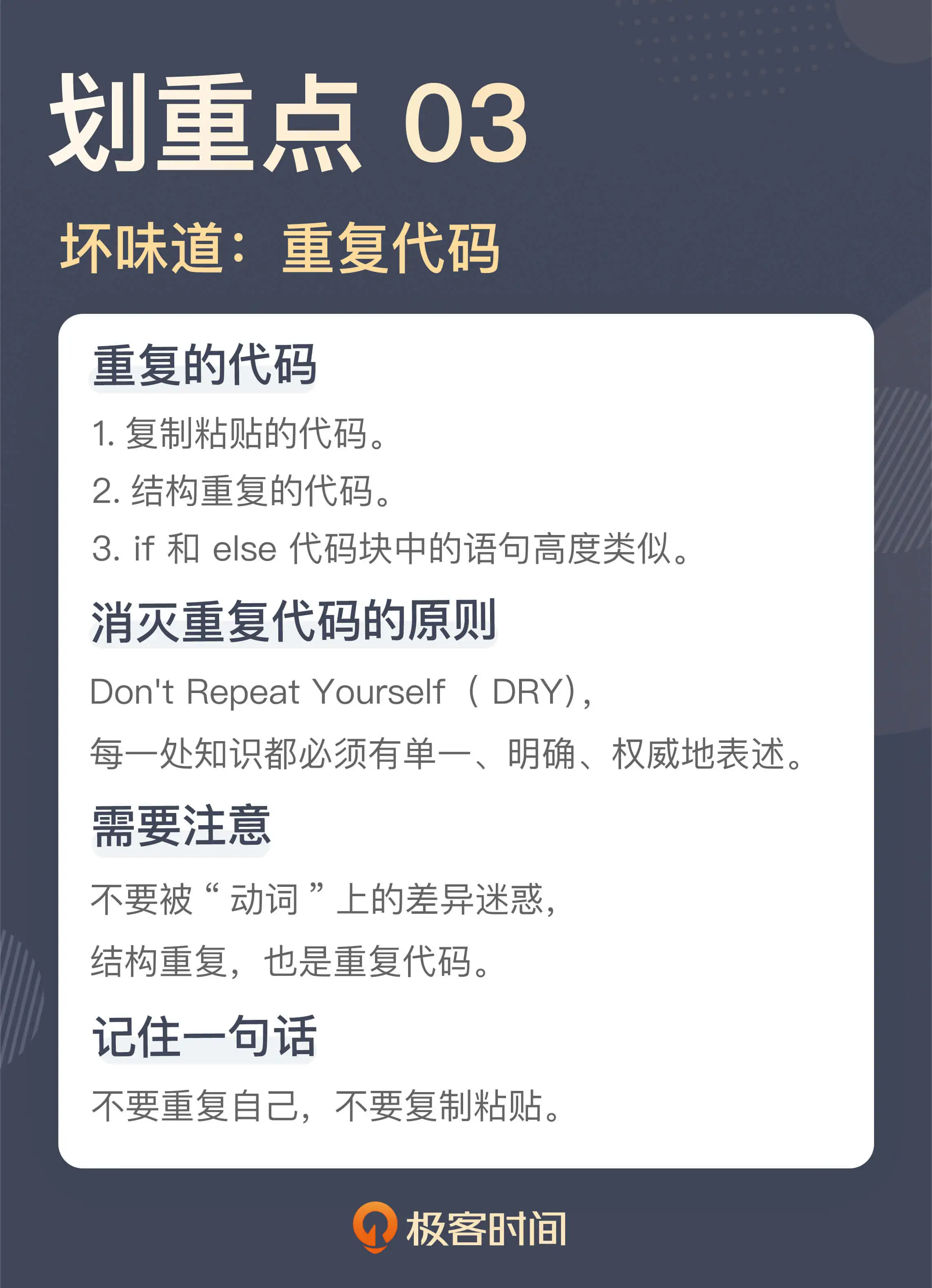 这一讲我们讲到重复代码,讲到了几个典型的坏味道: