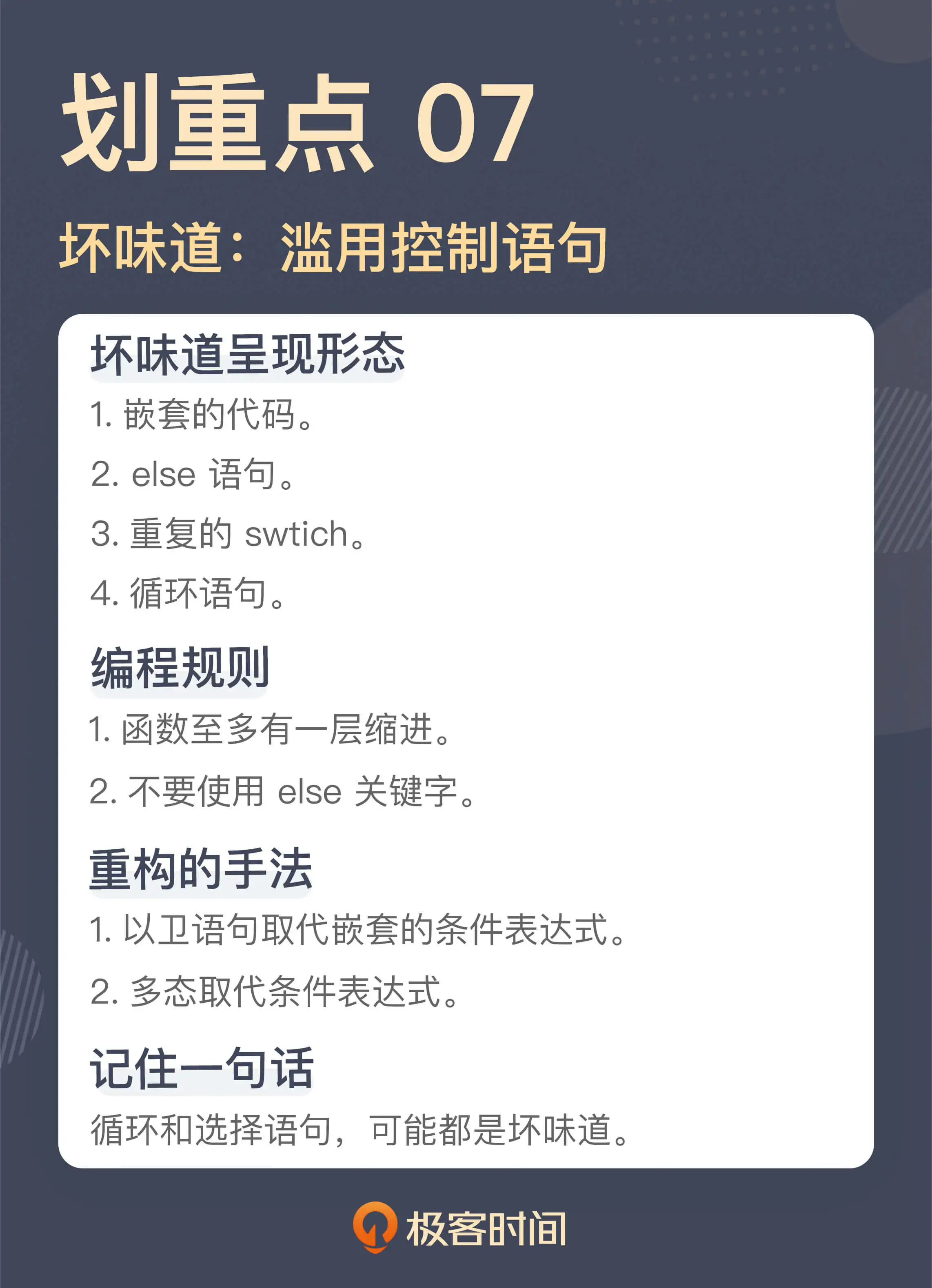 其实,关于控制语句还有一个坏味道,那就是循环语句。没错,循环本身就是一个坏味道,但讲解它还需要一些知识的铺垫,所以,我会把它放到后面第 13 节,讲“落后的代码风格”时再来讲解。这里,你只要知道循环语句也是一个坏味道就够了。