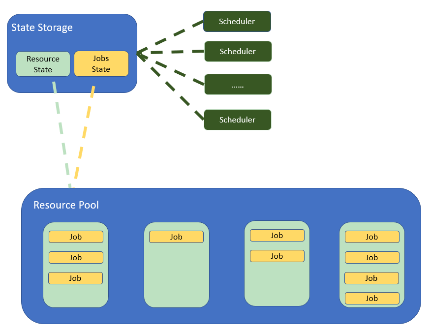 可以看出,共享状态调度架构为了提供高可用性和可扩展性,将集群状态之外的功能抽出来作为独立的服务。具体来说就是: