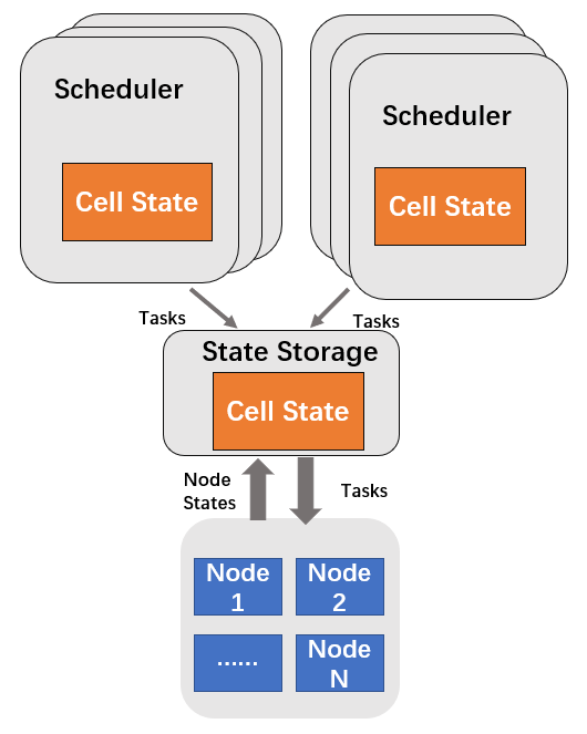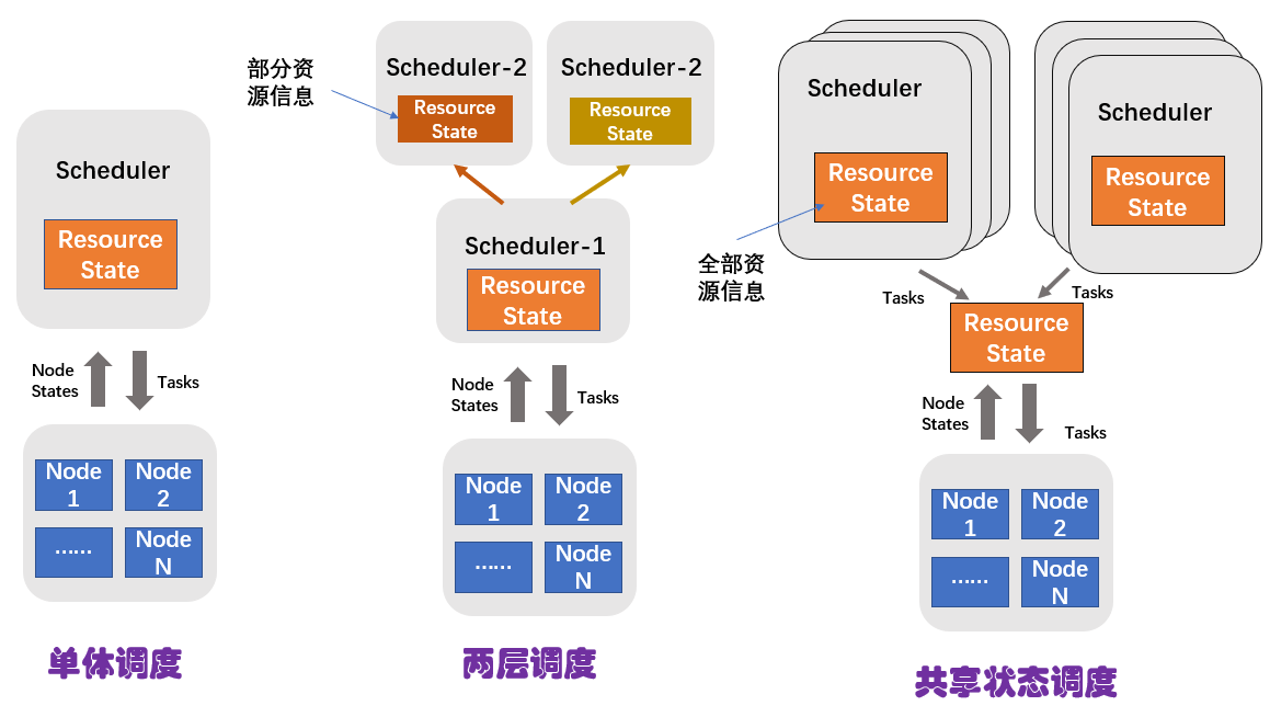 也就是说,这种调度架构在支持多种任务类型的同时,还能拥有全局的资源状态信息。要做到这一点,这种调度架构的多个调度器需要共享集群状态,包括资源状态和任务状态等。因此,这种调度架构,我们称之为共享状态调度器。
