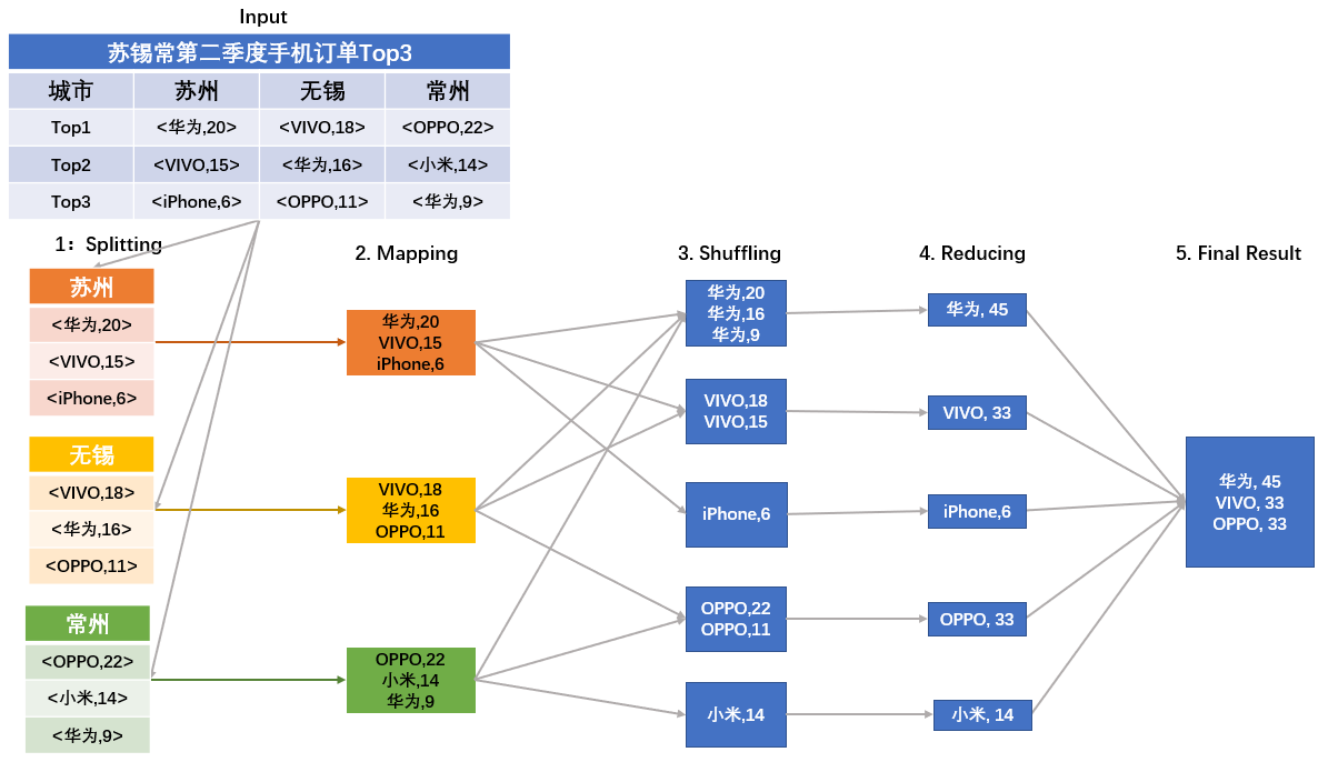 从上述流程可以看出,整个MapReduce的工作流程主要可以概括为5个阶段,即:Input(输入)、Splitting(拆分)、Mapping(映射)、Reducing(化简)以及Final Result(输出)。
