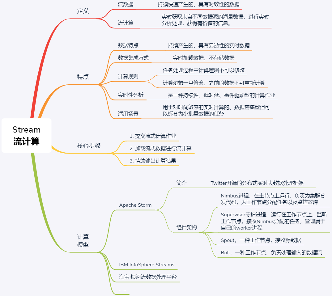 到这里,我们小结一下吧。流计算不提供流式数据的存储服务,数据是持续流动的,在计算完成后就会立刻丢弃。流计算适用于需要处理持续到达的流数据、对数据处理有较高实时性要求的场景。为了及时处理流数据,流计算框架必须是低延迟、可扩展、高可靠的。