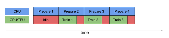 图中的“idle”指的是空闲时间。可以看出,如果不使用流水线,CPU 和 GPU/TPU 运作的时间没有重叠,因此在大部分时间都可能处于空闲状态。