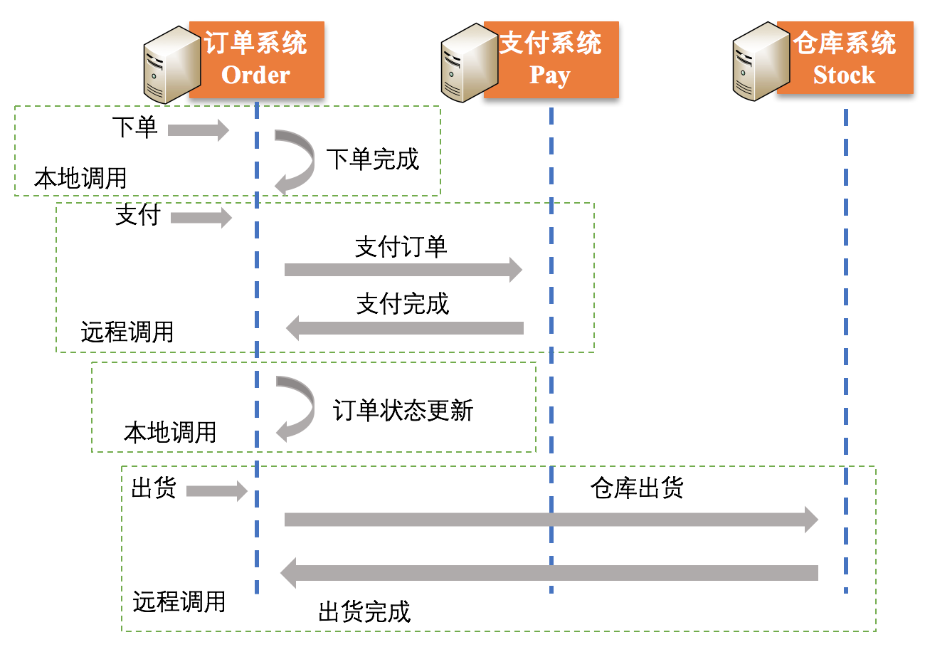 在整个过程中,“下单”和“订单状态更新”两个操作属于本地调用,而“支付”和“出货”这两个操作是通过本地的订单系统调用其他两个机器上的函数(方法)实现的,属于远程调用。