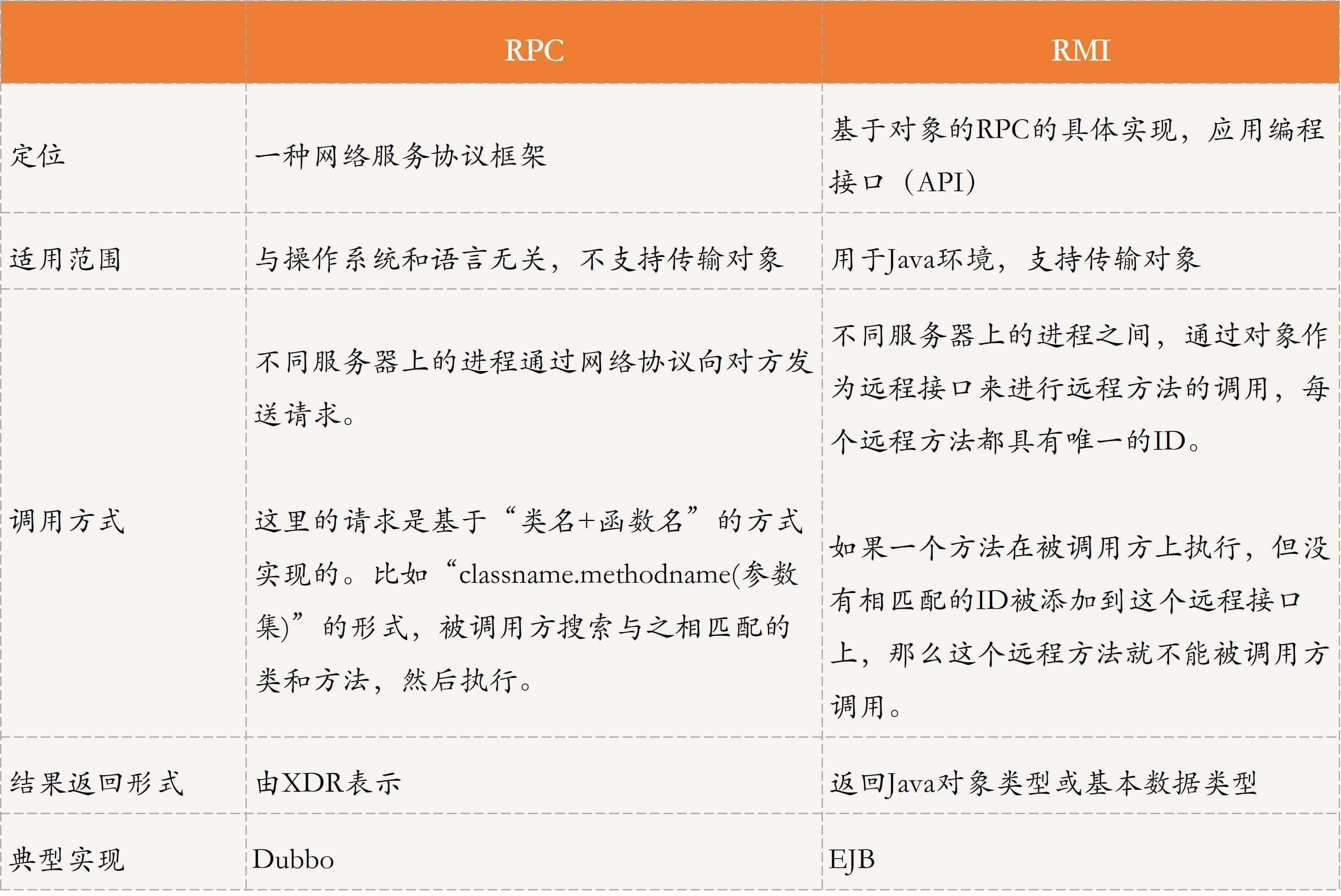 好了,上面我带你学习了RPC和RMI,接下来我通过一个表格来对比下它们的异同吧,以方便你进一步理解与记忆。