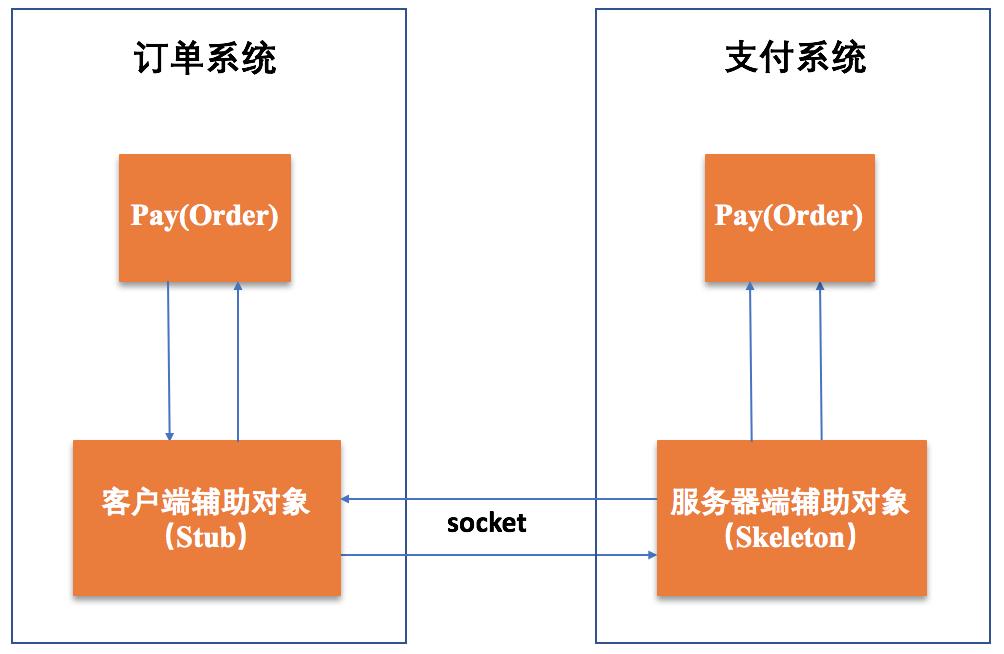 RMI的实现中,客户端的订单系统中的Stub是客户端的一个辅助对象,用于与服务端实现远程调用;服务端的支付系统中Skeleton是服务端的一个辅助对象,用于与客户端实现远程调用。