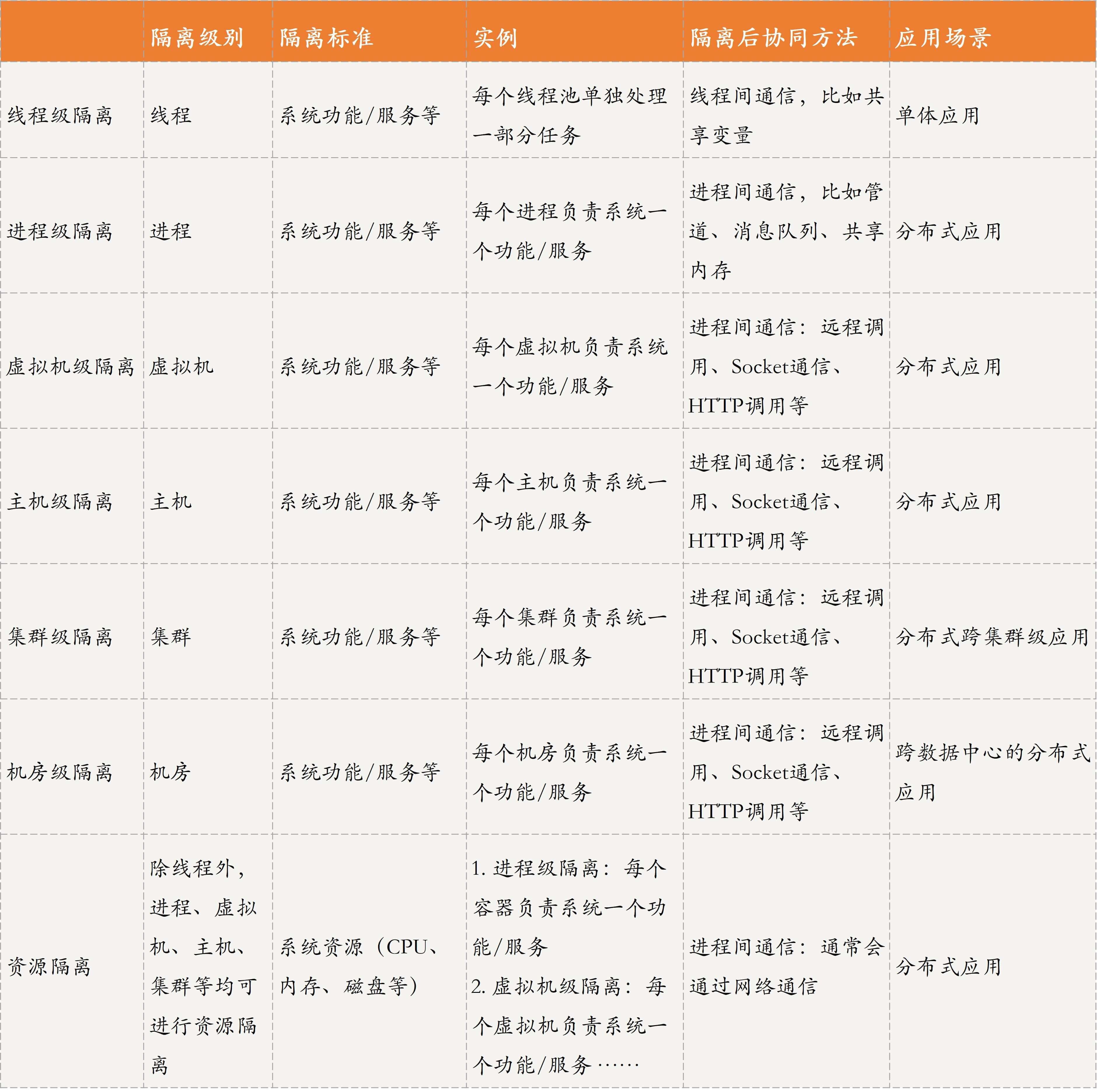 • 一类是以系统功能模块为粒度进行隔离。比如,通过系统功能/服务划分,将系统分为多个功能/服务模块,各个功能/服务模块之间实现松耦合,即一个功能/服务模块出现故障,不会影响其他功能/服务模块,根据功能模块或服务由线程执行还是进程执行,通常分为线程级隔离、进程级隔离。