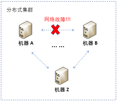 简单地说,网络故障就是分布式集群中,节点之间无法完成通信。比如,由机器A,B,……,Z构成的分布式集群中,机器间比如机器A和B之间无法完成通信,就属于网络故障。