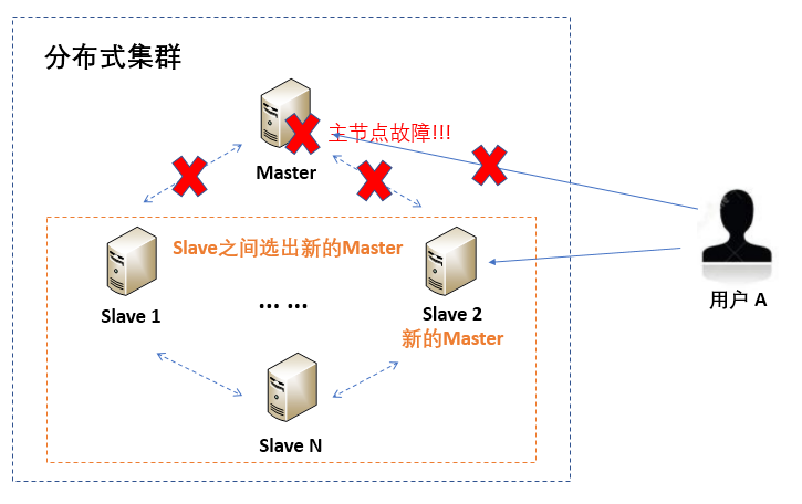 如下图所示,用户A访问分布式集群时一直是与Master交互的,但当Master故障后,其他Slave会通过分布式选举算法选出一个新的主节点。