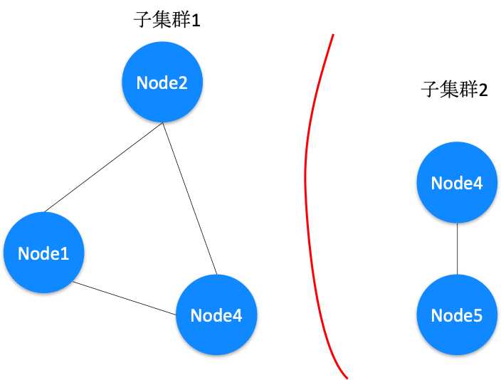 如下图所示,非集中式架构中,节点是对称的,因此网络分区的形态是形成不同子集,子集内节点间可互相通信,而子集之间的节点不可通信。比如,子集群1中Node1、Node2和Node4可以相互通信,子集群2中Node3和Node5也可以相互通信,但子集群1和子集群2之间网络不通。