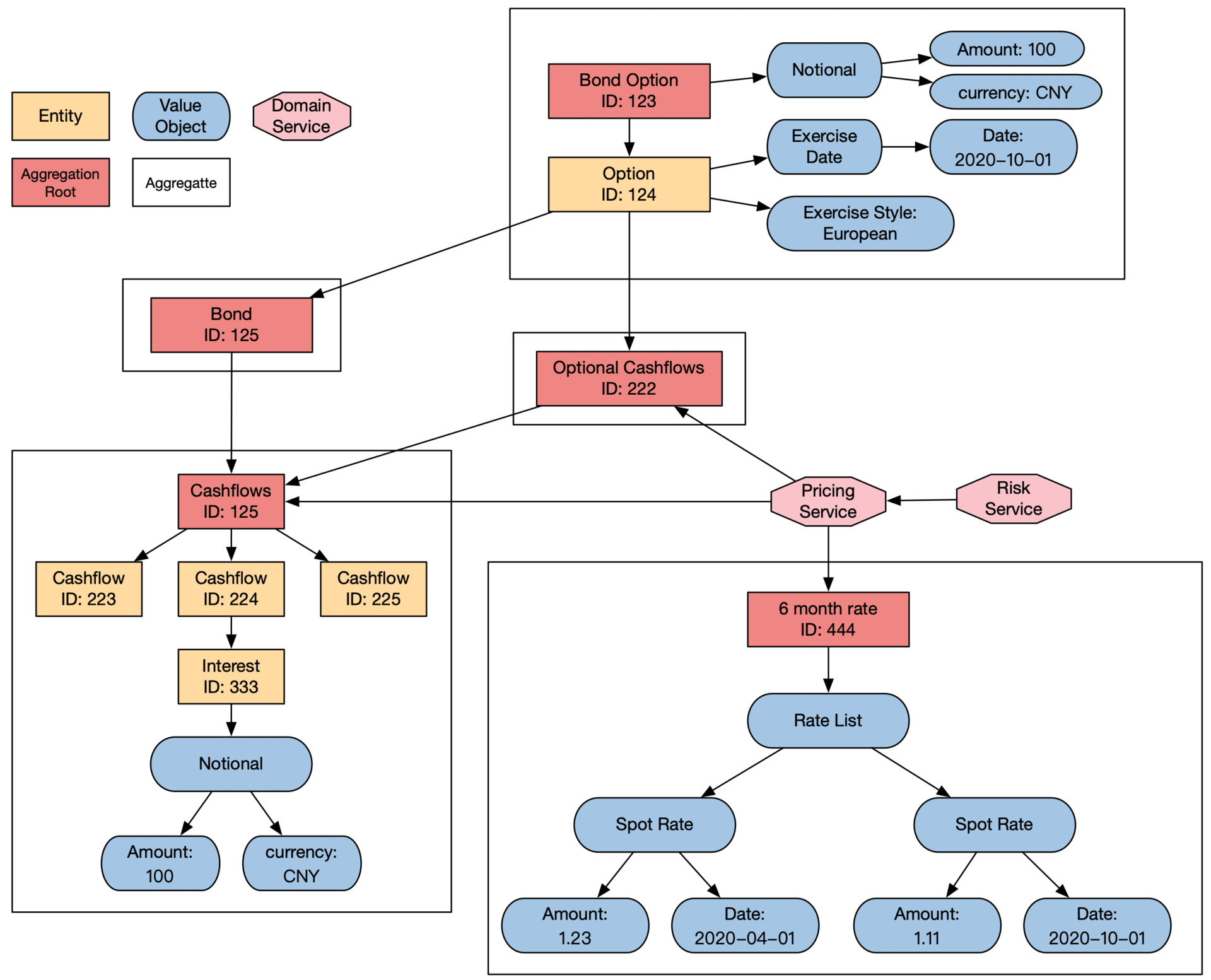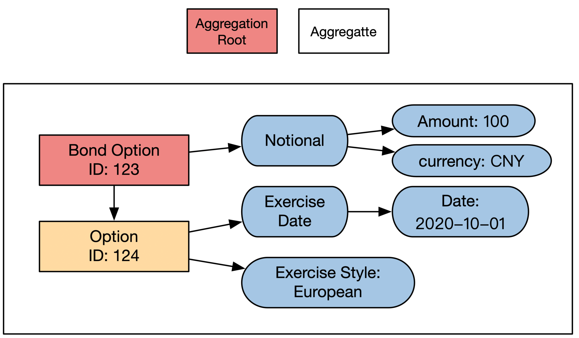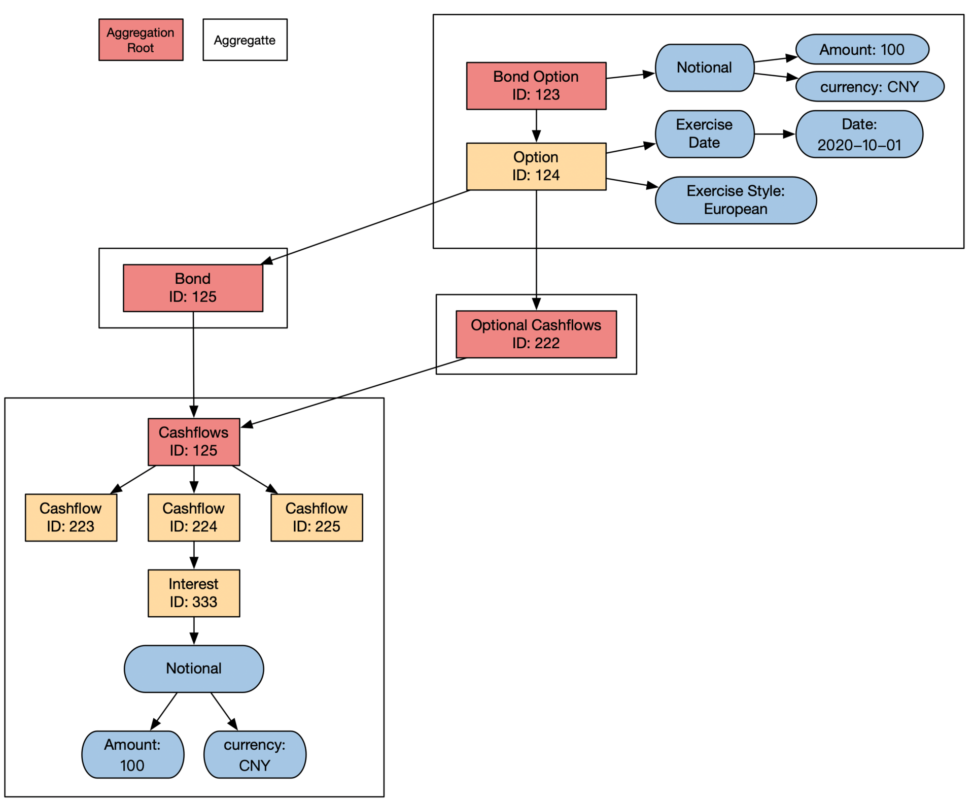 比如开头例子的债券期权(Bond Option),它就是一个聚合根。通过它可以访问到债券起源合同的其他内容。债券期权的聚合和聚合根示意图如下: