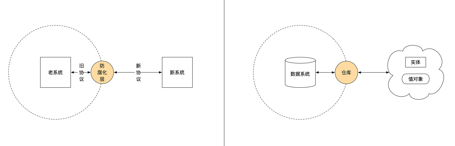 仓库也能防腐化,它分隔了数据的使用和存储,这样数据使用的变化就不会影响到数据存储。如下图所示,左边是防腐化层的示意图,右边是仓库的示意图:
