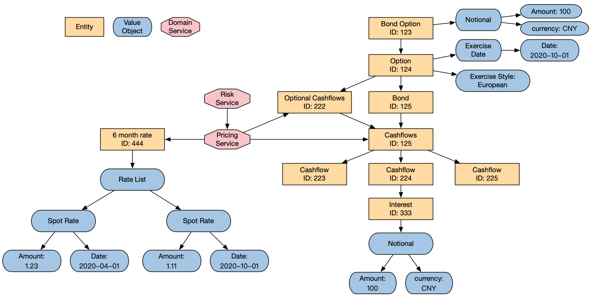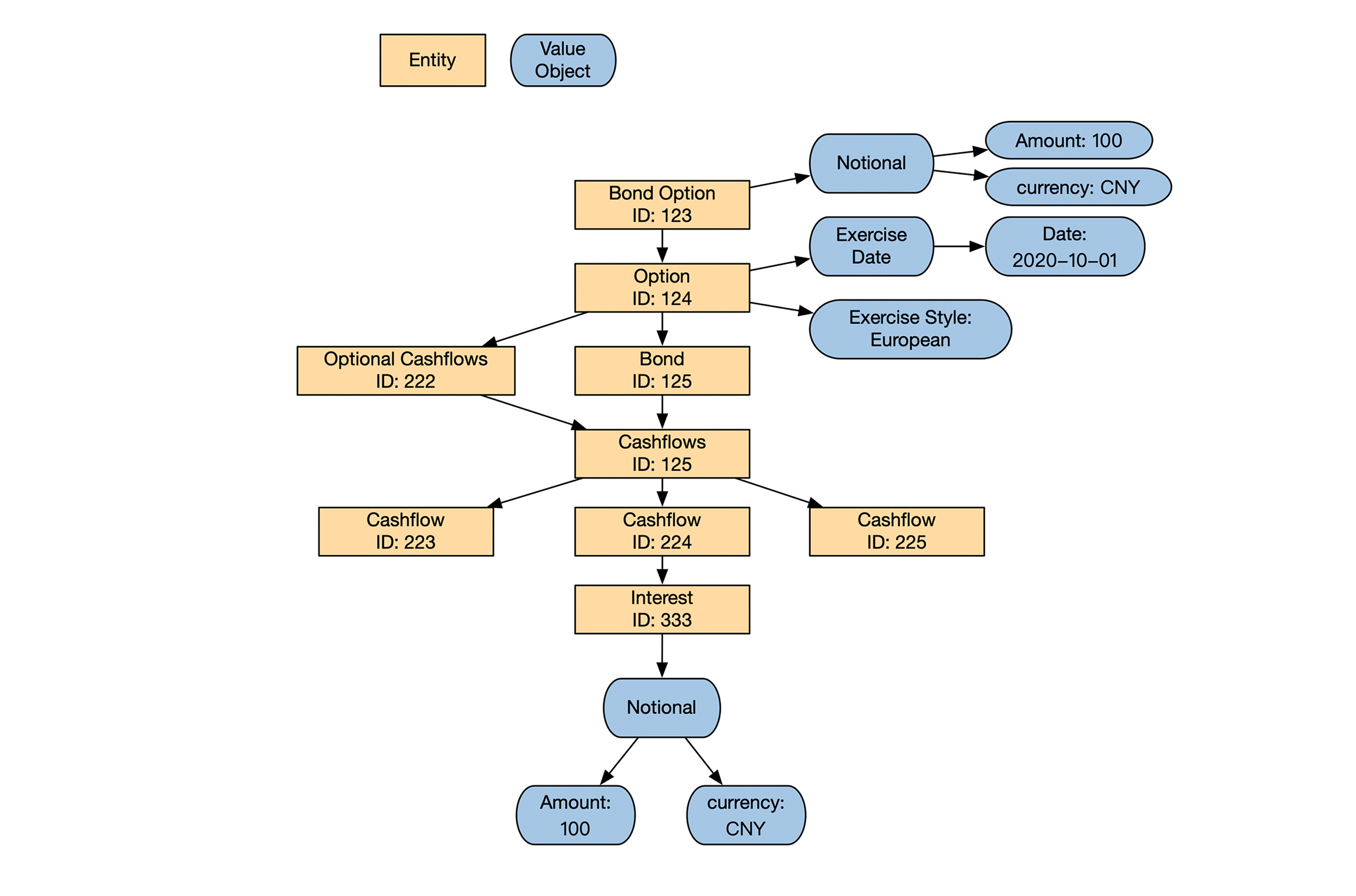 反过来说,如果一个金融业务对象具有上面这三个特点,那么它很有可能被建模成实体。在这个债券期权的例子里,期权和债券都是实体。
