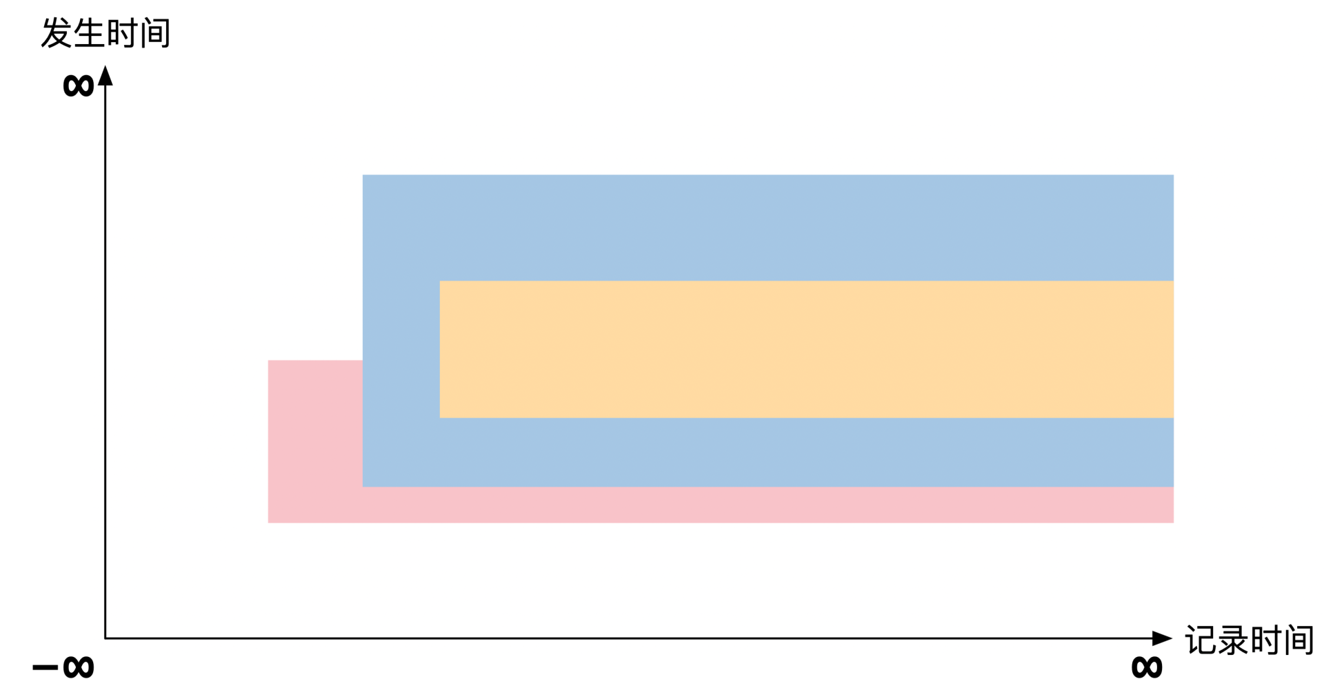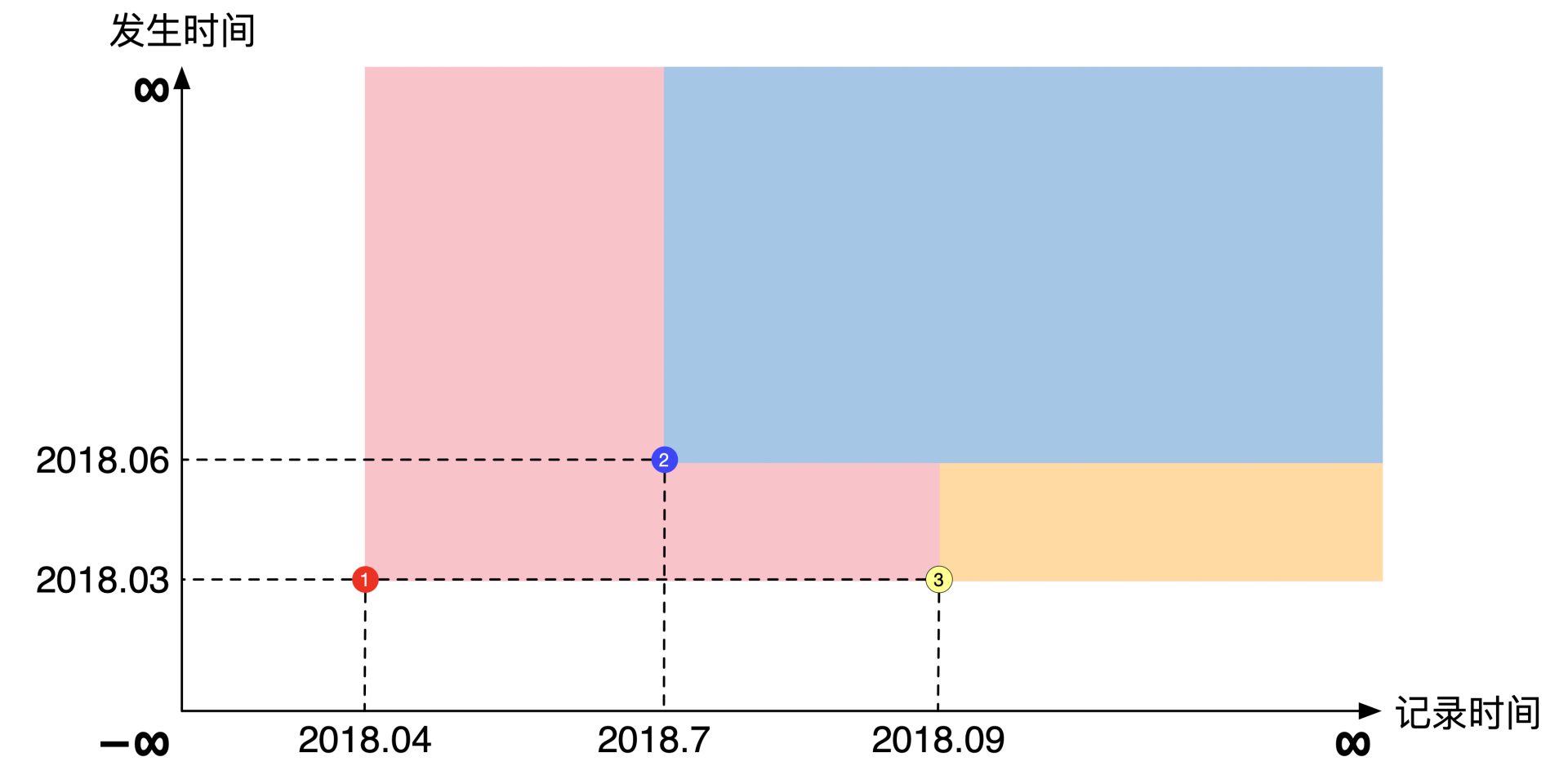 按照行业惯例,横轴是记录时间,纵轴是发生时间。理论上每个轴都指向正负无穷远,但是在实际展示中通常将坐标原点表示为负无穷远,主要是为了画起来好看。示意图如下: