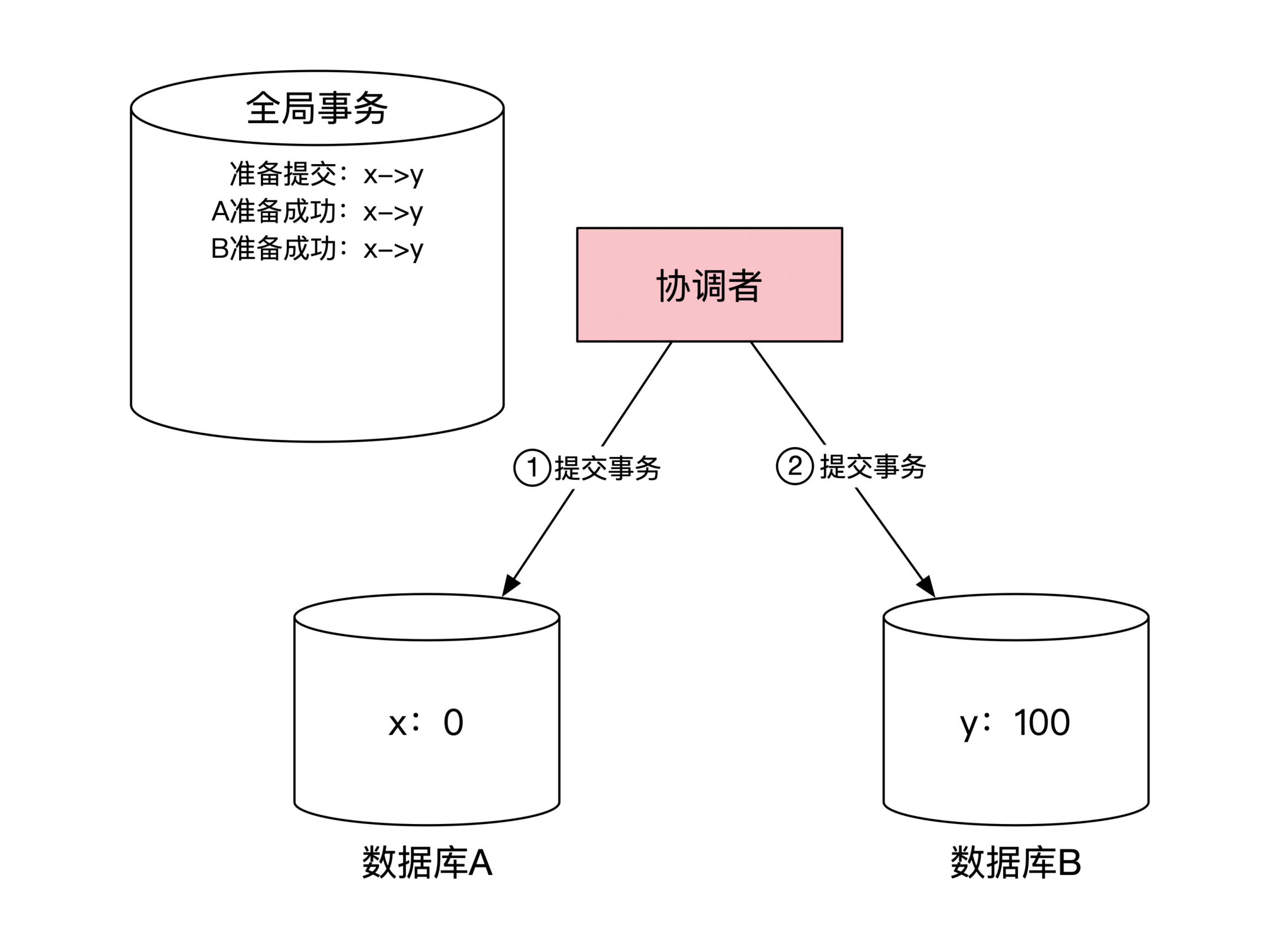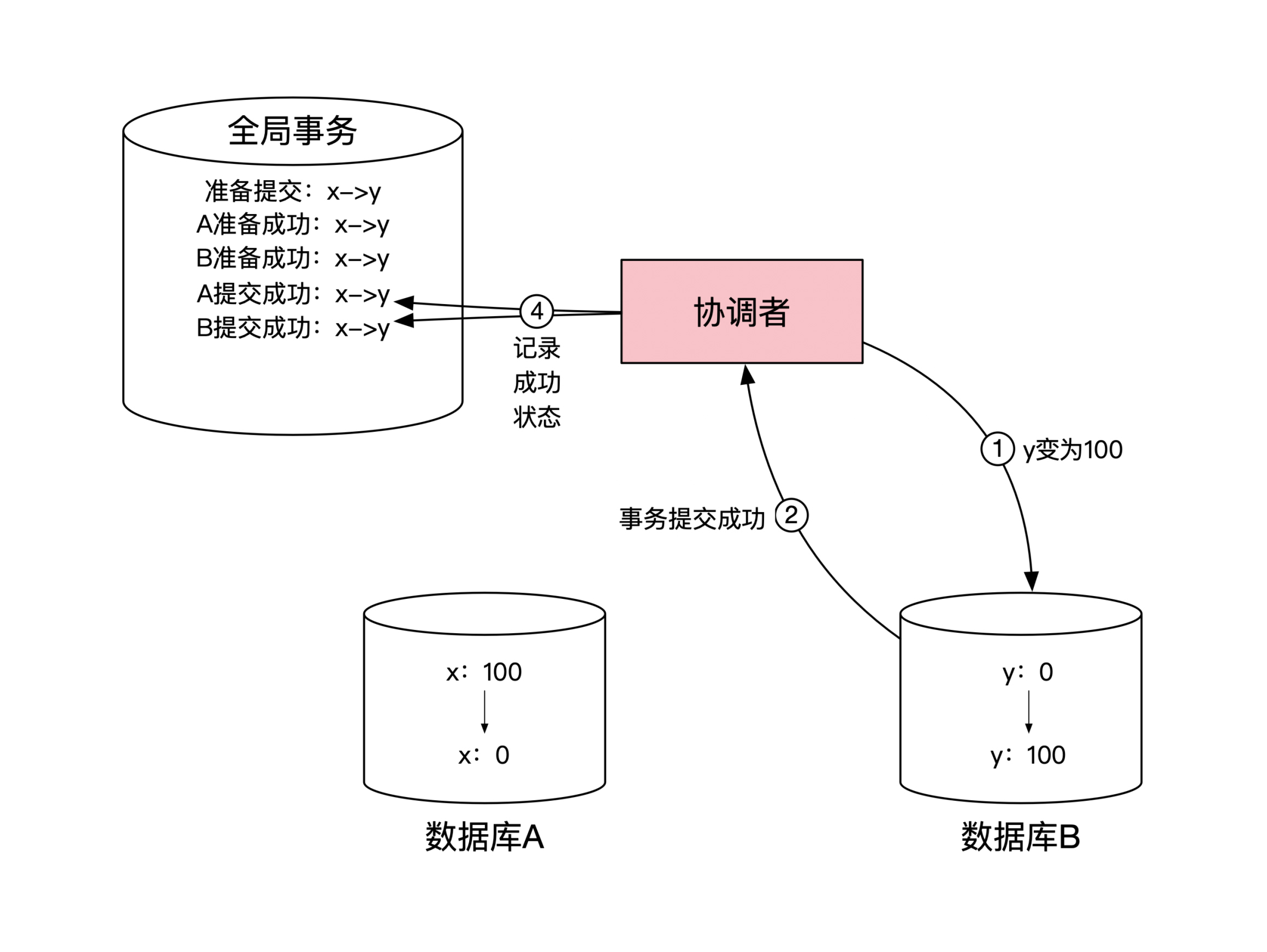 假设和前面一样,一个用户 x 的账户开始有100元钱,账户信息存储在数据库 A 中。另一个用户 y 的账户里最开始没钱,账户信息存储在数据库 B 中。然后系统发起了一笔从 x 到 y 的转账,金额为100元。所以转账后 x 的余额为0,而 y 的余额为100。