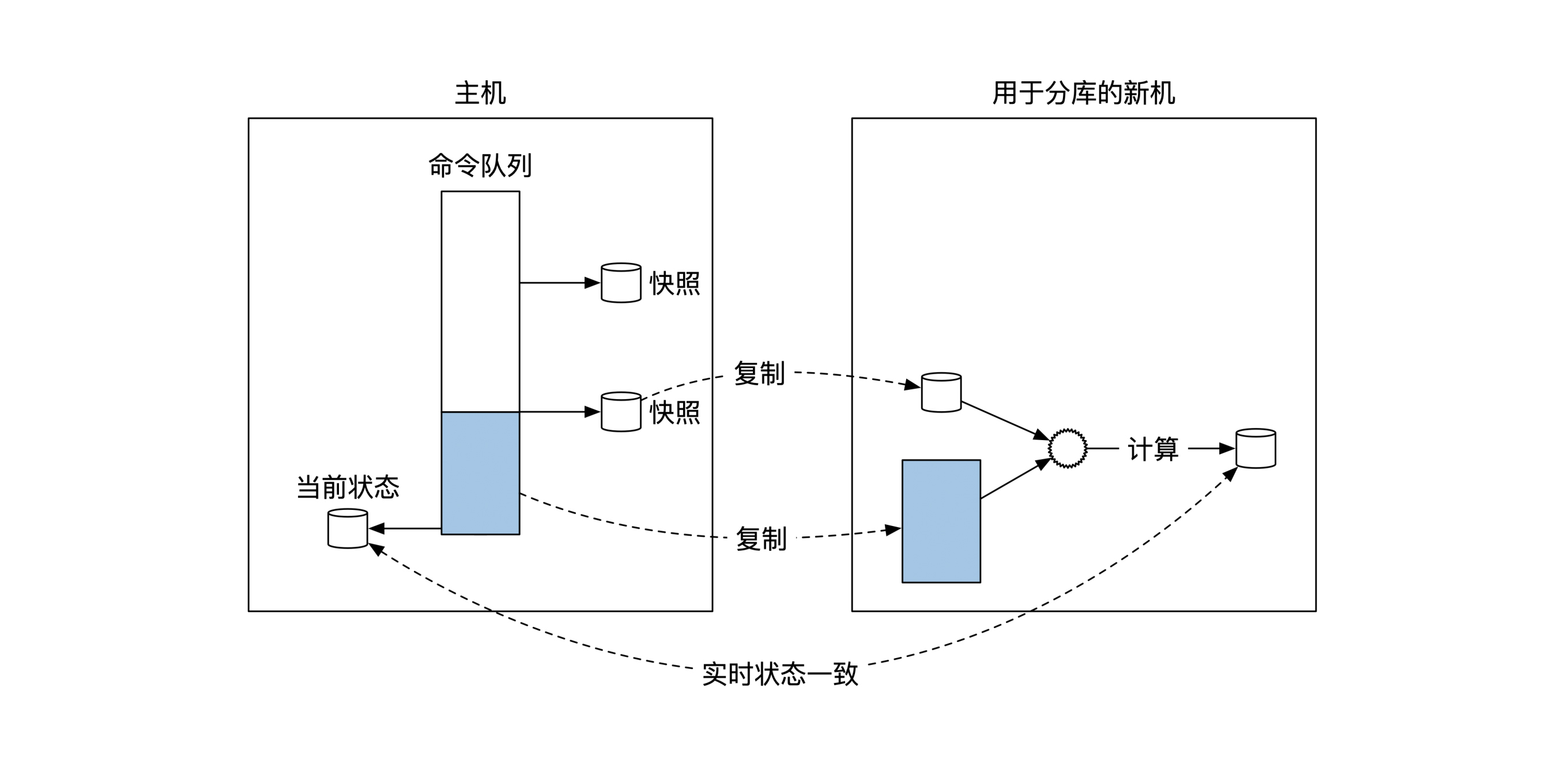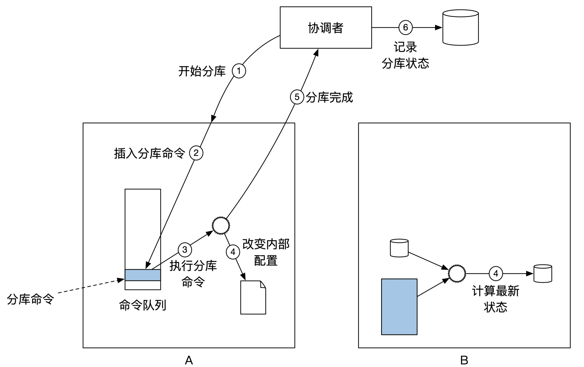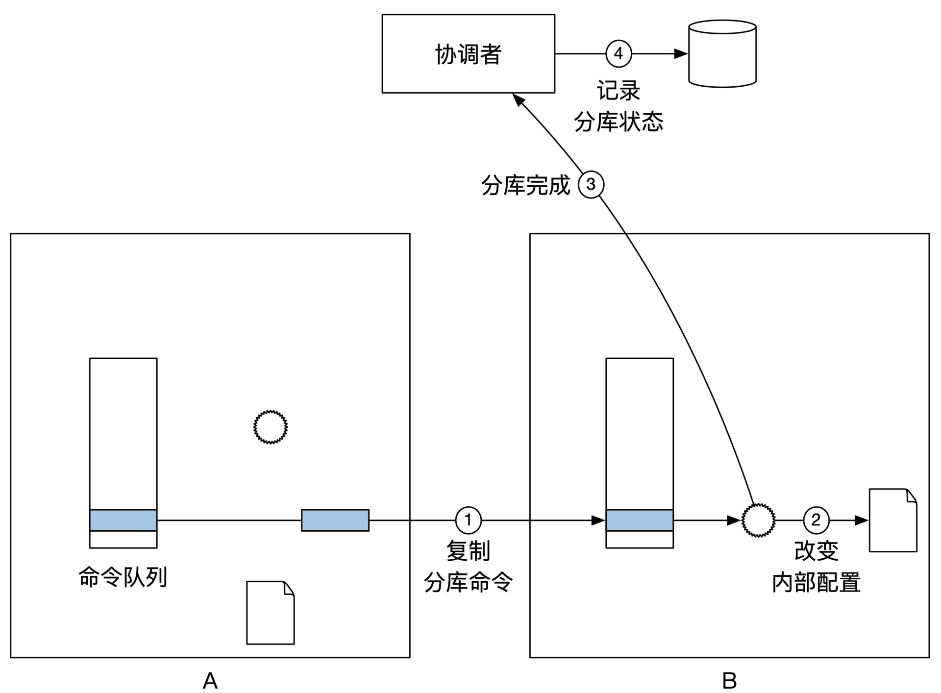 集群A收到开始分库的消息之后,在自己的命令队列中记录一个特殊的命令,叫作分库命令。这个分库命令记录的是详细的分库细节,比如分完库后,集群A能处理哪些事情,集群B又能处理哪些事情。