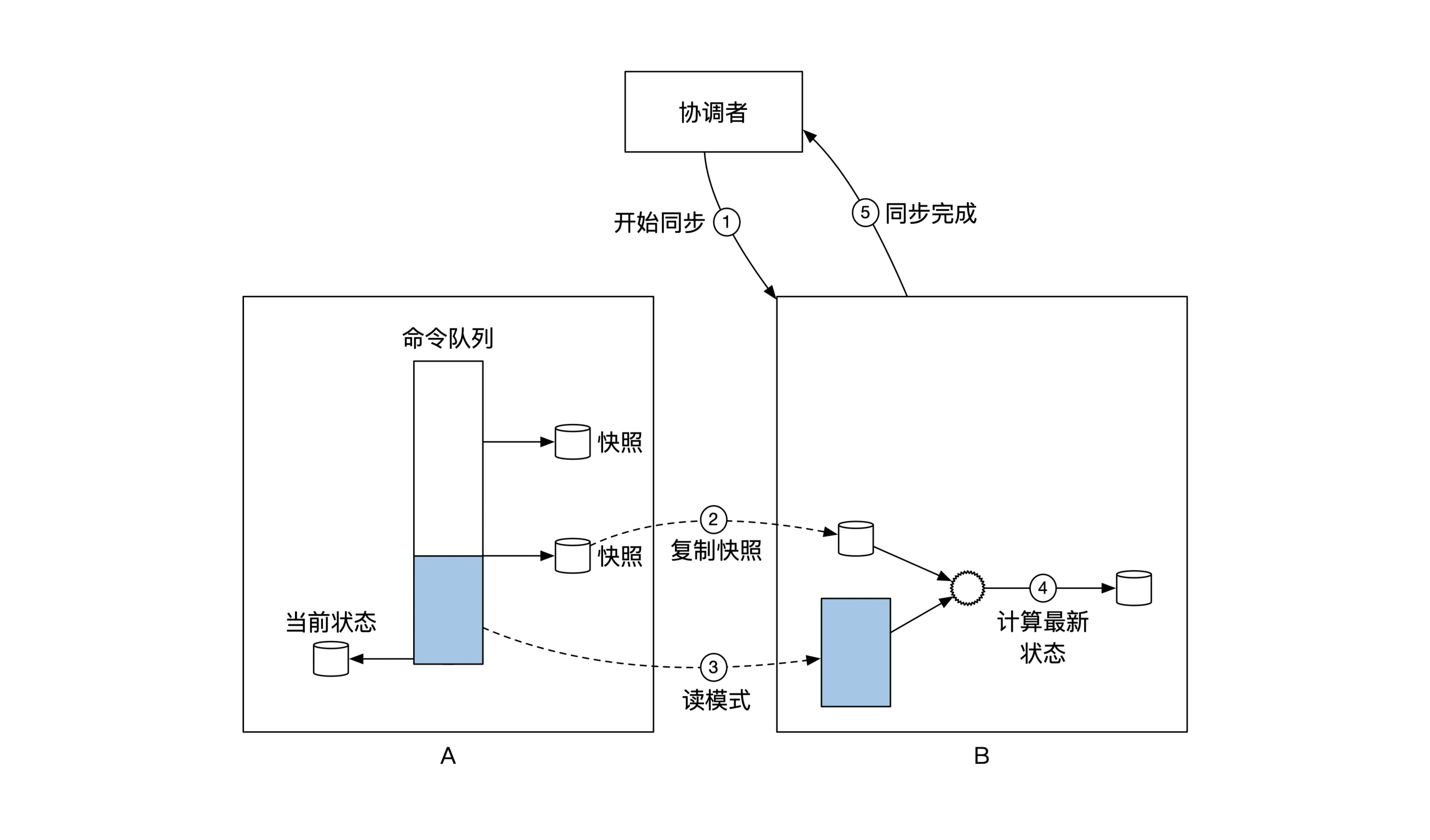 集群B收到同步数据的指令后,它会先从集群A里复制一份最新的快照文件,并且按照这个快照文件恢复到过去某个时间点的状态。