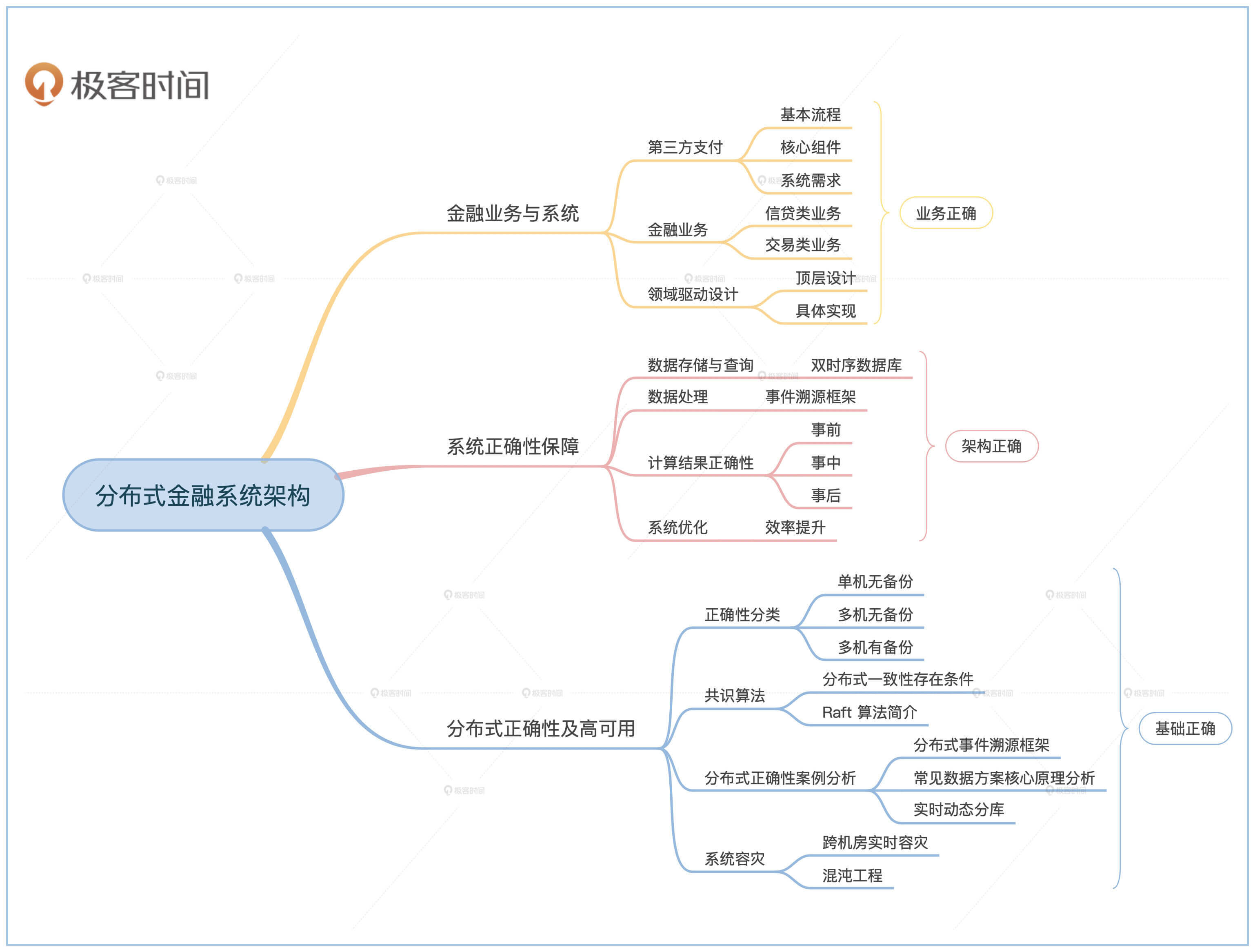 还记得我们在开篇词给到的分布式金融系统全景图么?这三个部分,分别对应的是业务正确、架构正确以及基础正确这三个维度。