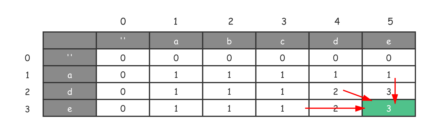 其中红色箭头展示了状态转移的计算方向。从图中可以得知,\(DP\[2\]\[4\] = 2\),其含义是 “ad”(即 \(text2\[0 … 2\]\))和 “abcd”(即 \(text1\[0 … 4\]\))的最长公共子序列的长度;\(DP\[3\]\[5\] = 3\) 即 “ade”(即 \(text2\[0 … 3\]\))和 “abcde”(即 \(text1\[0 … 5\]\))的最长公共子序列的长度,即原问题的答案。