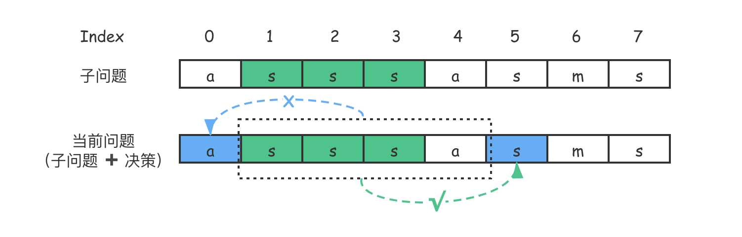 那么让状态转移的决策是什么呢?其实这里的决策跟回文子串问题类似,当前子问题的答案就是通过前面的子问题 ➕ 当前的决策推导出来的。