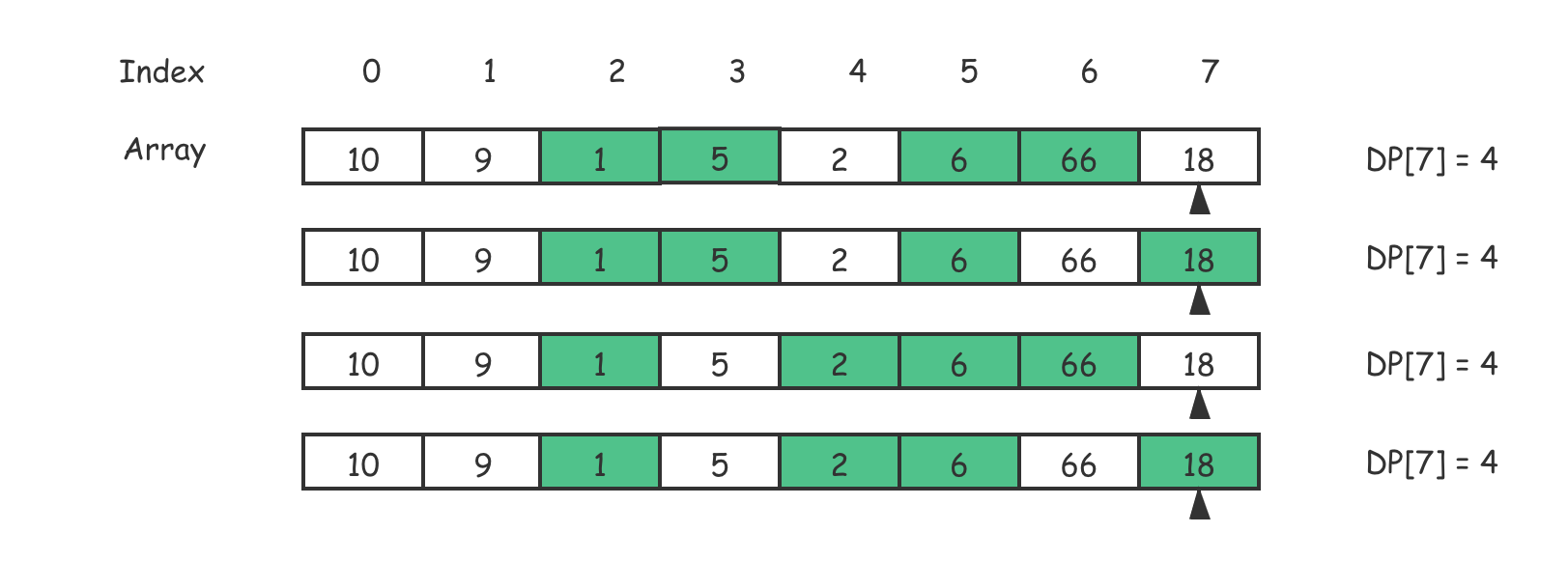 从图示中我们可以看出,有四种到达 \(DP\[7\]\) 状态的最长上升子序列的长度均为 4。这意味着,由 [1, 5, 6, 66]、[1, 5, 6, 18]、[1, 2, 6, 66] 和 [1, 2, 6, 18] 构成的四个子序列的长度均为 4,它们都符合题设的要求。因此,对于这样的输入,最长上升子序列的数量是 4。