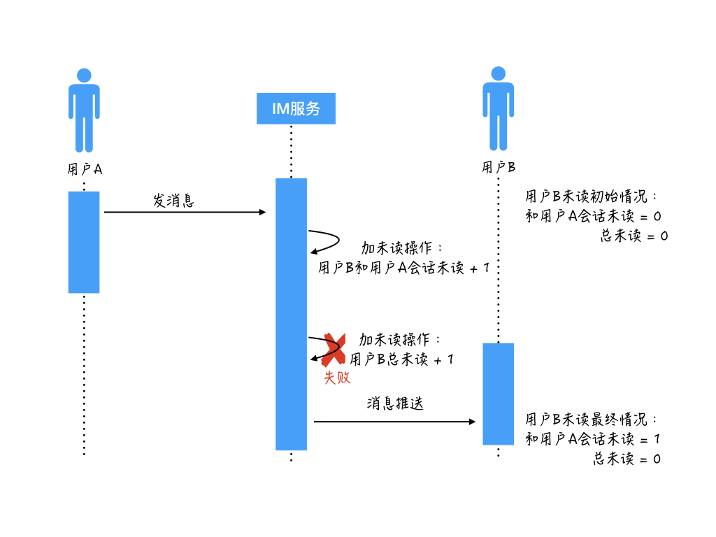 假设加未读操作第一步成功了,第二步失败。最后IM服务把消息推送给用户B。这个时候用户B的未读状态是:和用户A的会话未读是1,总未读是0。