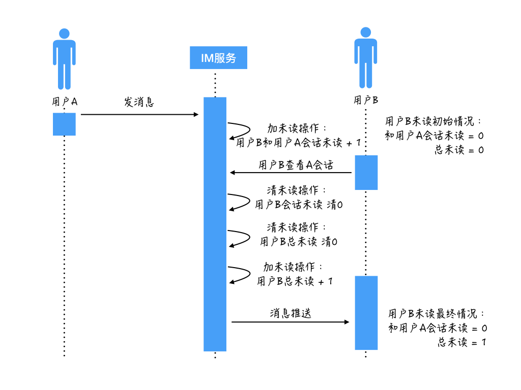 消息到达IM服务后,执行加未读操作:先把用户B和用户A的会话未读加1,再把用户B的总未读加1。