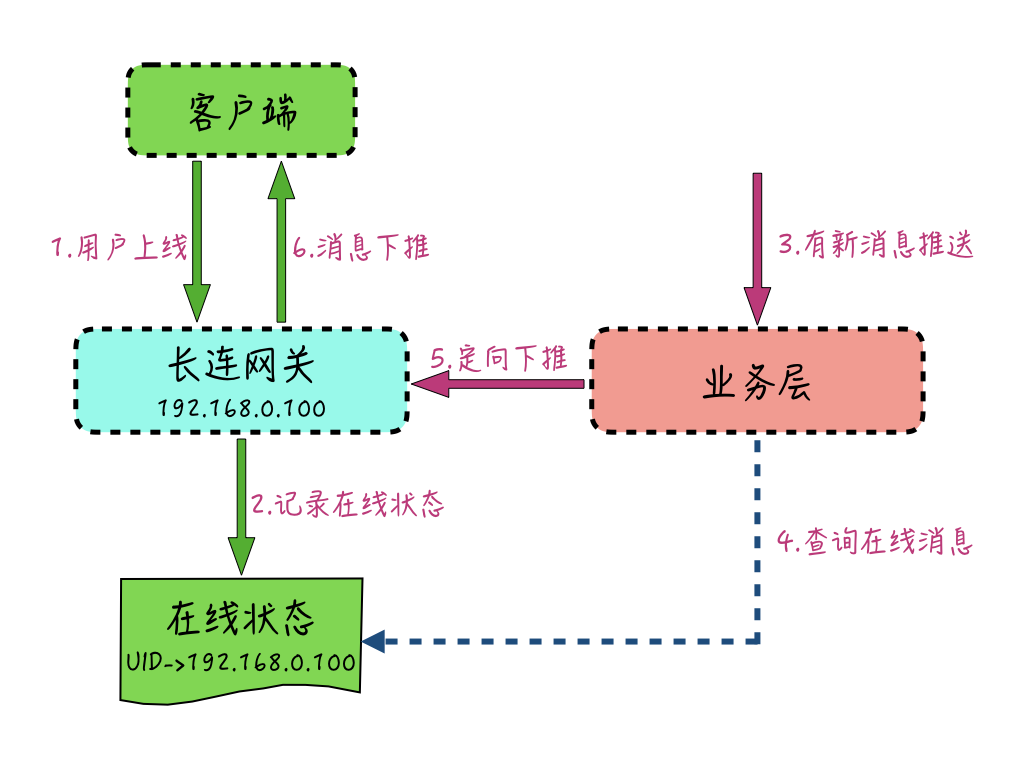 用户通过接入服务上线后,接入服务会在中央资源中(比如Redis)记录当前用户在哪台网关机上线。如果业务层有消息需要推送给这个用户时,通过查询这个中央资源,就能知道当前用户连接在哪台网关机上,然后就可以通过网关机的API接口,把消息定向投递推送给用户了。
