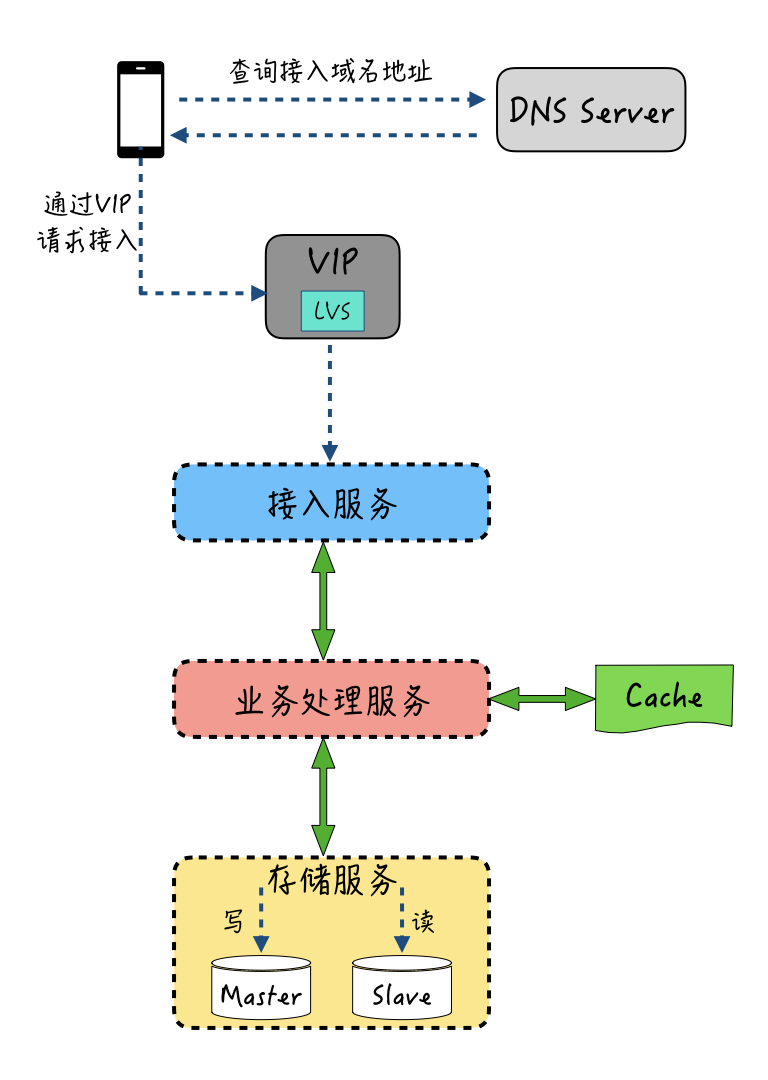 LVS运行在操作系统内核态,会按照设定的负载均衡策略,将IP数据包分发到后端接入网关机,接入服务器再把数据透传给业务处理服务层,业务处理服务进行具体的业务逻辑处理,比如读写缓存和消息存储等。