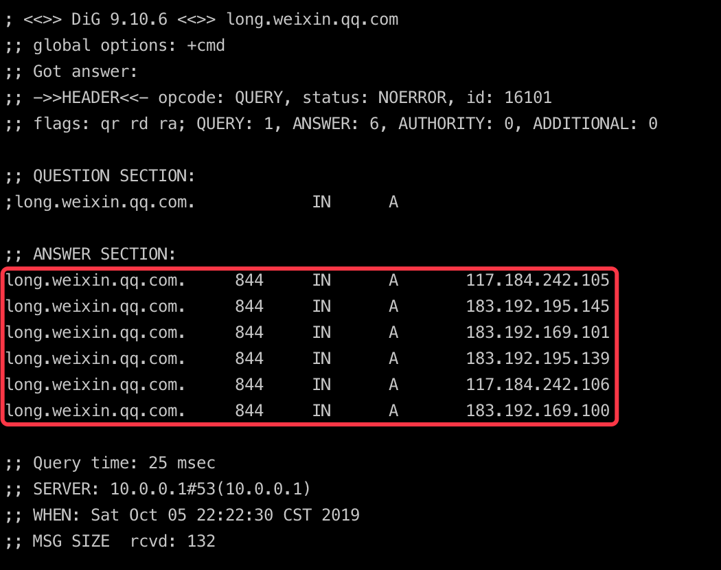 比如上图所示:微信长连接通道针对同一个域名进行DNS查询,就返回了多条A记录供接入设备选择。