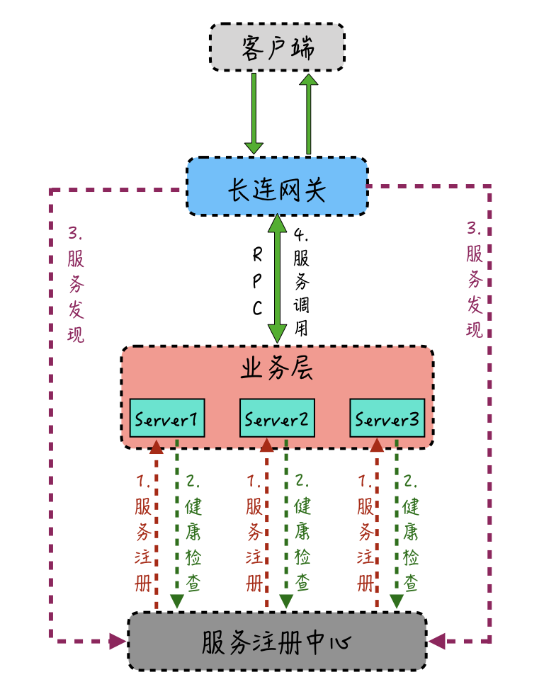 长连网关机在需要调用业务层服务时,会先通过服务发现、获取当前要用到的服务所注册的业务服务器地址,然后直连某一台具体的业务服务器进行RPC服务调用。